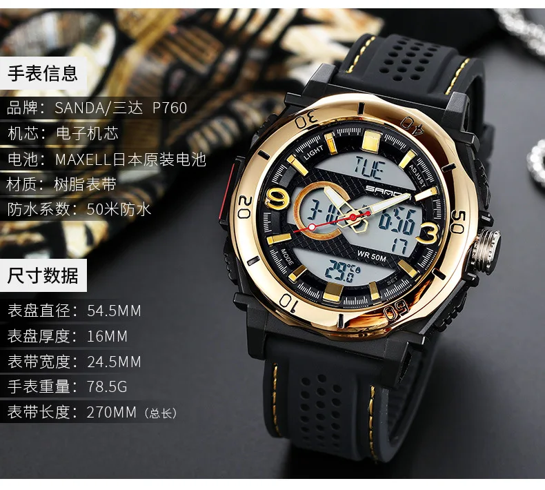 SANDA Роскошные многофункциональные аналоговые цифровые спортивные часы мужские армейские военные наручные часы с резиновым ремешком Водонепроницаемые светодиодные кварцевые часы