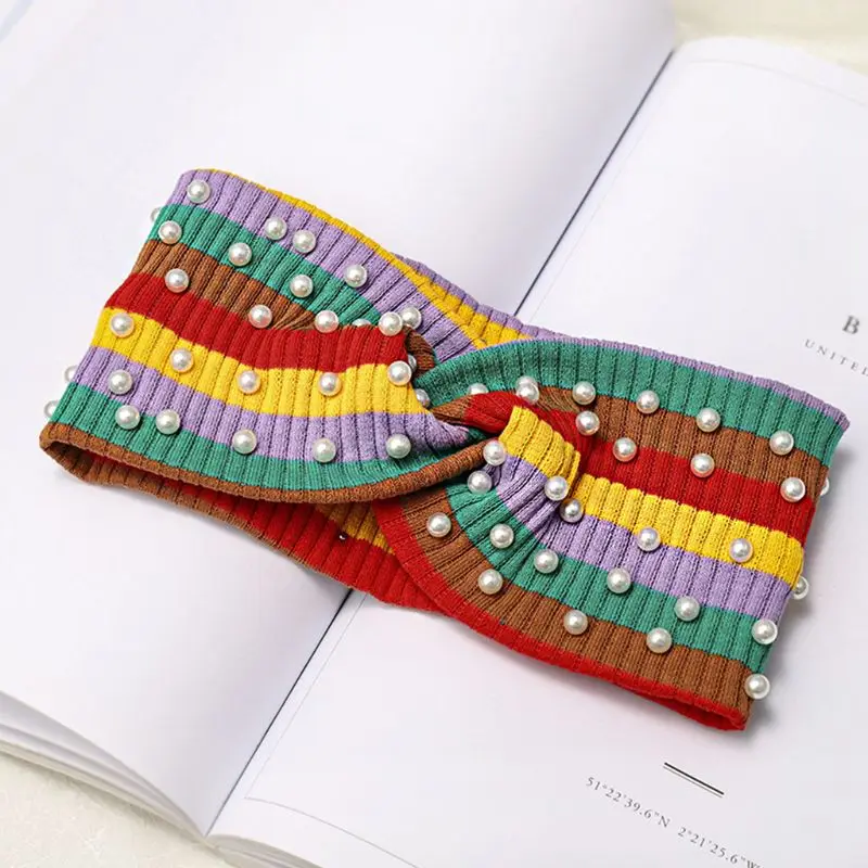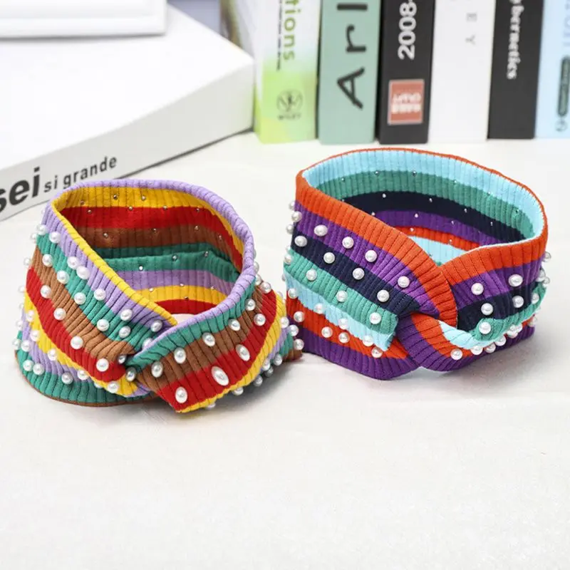 Studded Fashion Sports Hair Band Knitted Rainbow Stripes Elastic Headband Inlaid Artificial Pearl Sweet Girls Women Washing Headbands Headwear