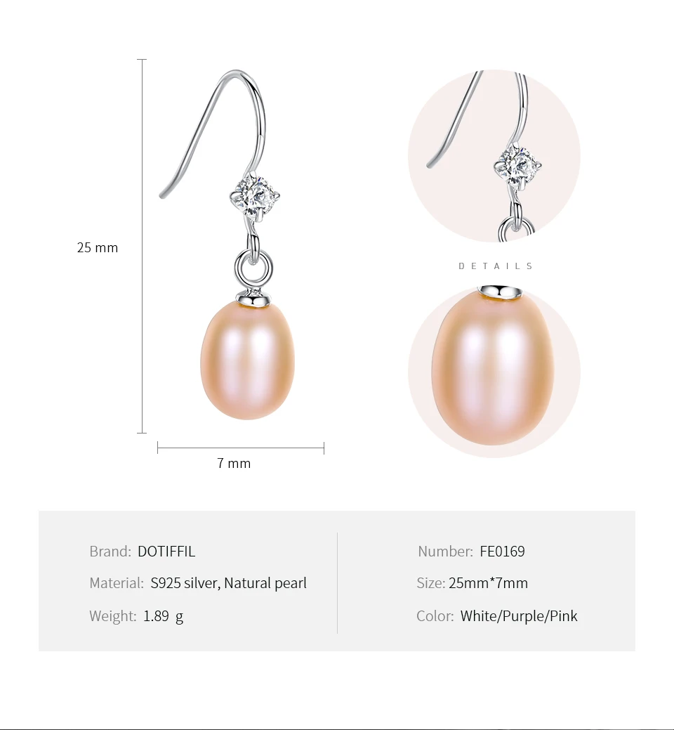 Бренд: DOTEFFIL Тип камня: 100% натуральный пресноводный жемчуг Цвет жемчуга: белый, фиолетовый, оранжевый Жемчужный Блеск: AAAAA Поверхность жемчуга: без дефектов Размер жемчуга: 7 мм Длина: около 25 мм Вес: 1,89 г Материал металла: 100% 925 пробы Серебряный Металлический штамп: S925 Упаковка: Подарочная сумка Они модные и элегантные, подходят для ношения круглый год Вы можете носить его на свадьбу/вечерние/помолвки/юбилей Роскошная блестящая ручная работа/высокое качество
