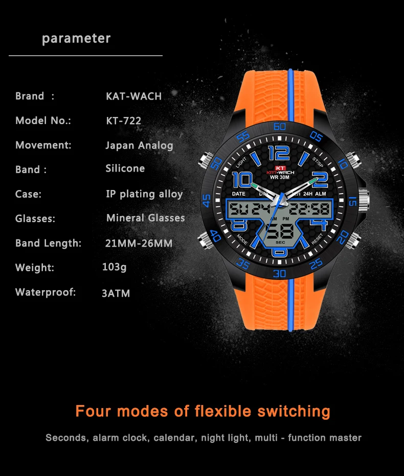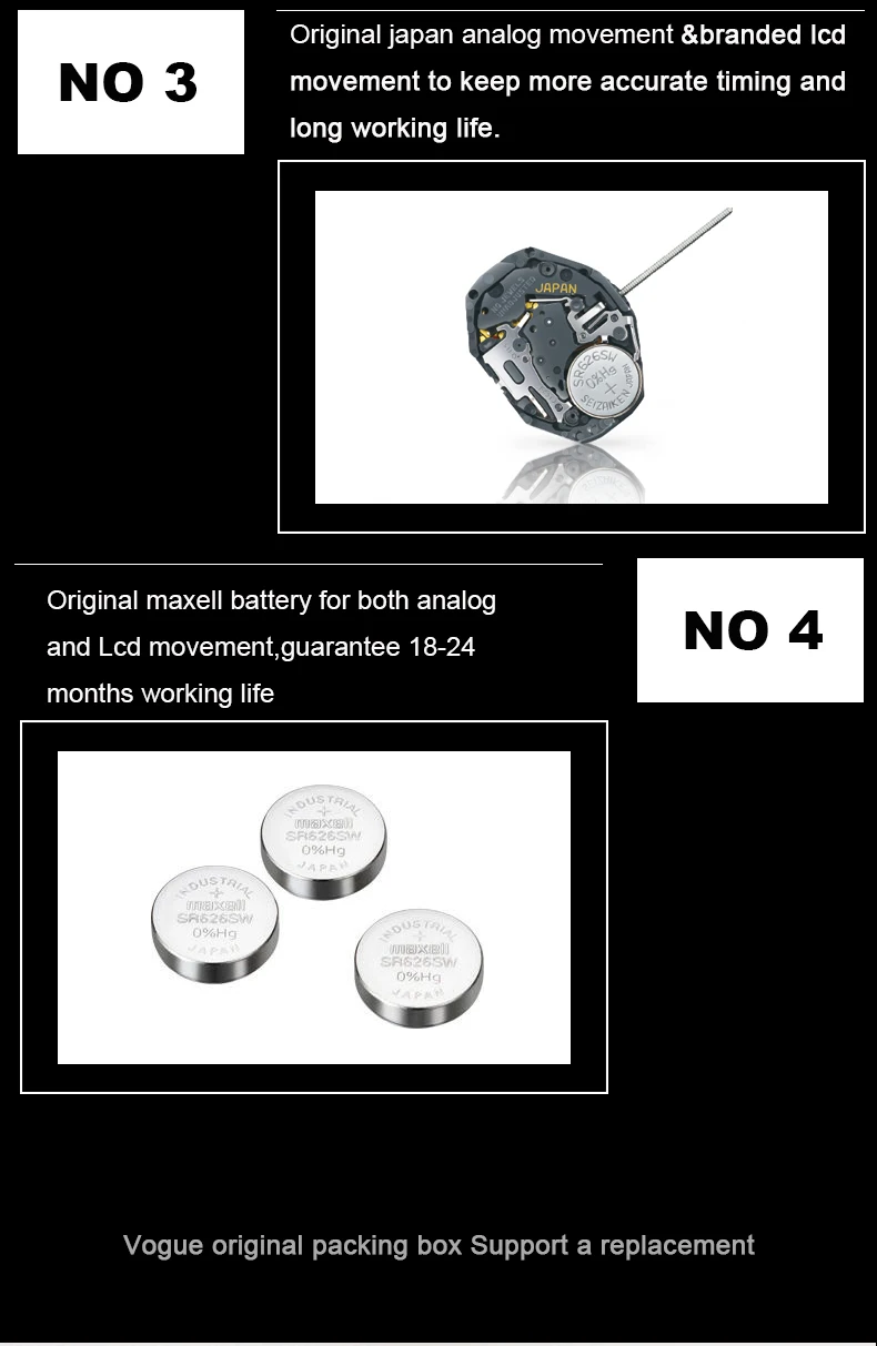Specification: Case diameter: 5.0cm(1.85inch) Case thickness: 1.6cm (0.59inch) Max Band length: 26.0cm (8.26inch) Max Band width:2.0cm(0.98inch) Net Weight:108g MULTIFUNCTIONAL:Both LED backlight and the traditional analog quartz movement time display of the specific design,3ATM daily life water resistance,enable with time display,date,,week and alarm chronograph function. WATERPROOF:3ATM waterproof 30 Meters for daily use. Suitable perfectly for all kind of daily use. Hand wash, shower, sweating or rainy day,NO PROBLEM!In general, withstands splashes or brief immersion in water ADVANCED MANUFACTURING TECHNOLOGY:Original Japanese time module quartz movement,real stainless steel buckle and back case,comfortable Silicone watch band,a perfect watch for outdoor sport lover. DUAL TIME DISPLAY:Digital LED numeral time display and analog quartz watch time display,looks so cool.Press the button on the case and the luminous bright time display is easy to read in the darkness. DURABILITY:In addition to strong base of silica gel , hydrofluoric acid, do not dissolve in water and any solvent, non-toxic, odorless, chemically stable. Product description Feature: Additional backlight function to show the time clearly in the darkness Four buttons to control different functions 30 meters water resistant (PLEASE DON'T PRESS ANY KEYS UNDERWATER) Material: Case material: alloy Band material: Silicone Dial window material type: hardlex Mirror surface: scratch resistance lens Package Included: 1 * Nice watch 1 * Document **NOTE**: Please DO NOT pull out the button under the water. Too much water contact or use it in the extreme hot or cold temperature will shorter the watch life.