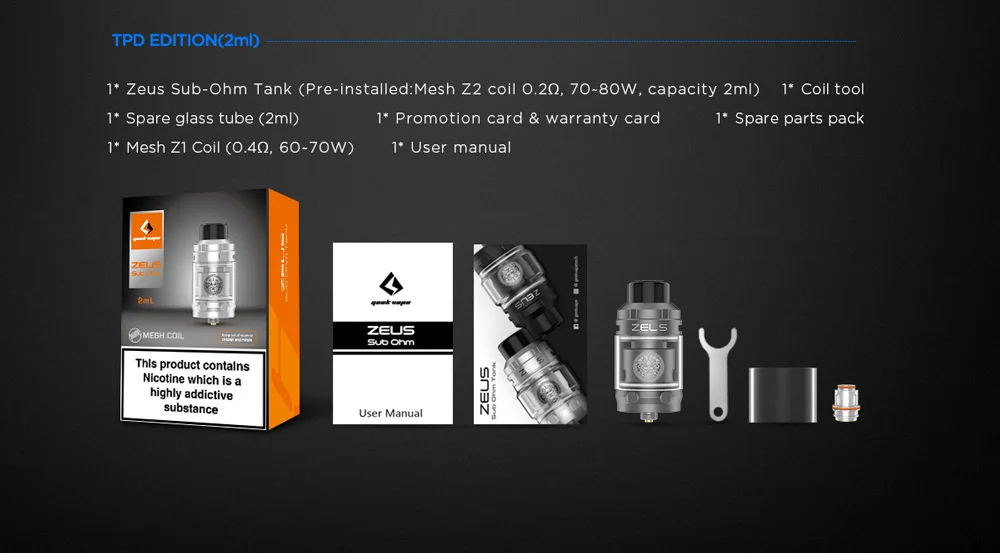 Geekvape Zeus Sub ohm Tank Новая версия серии Zeus. Geekvape Zeus имеет диаметр 26 мм и емкость 5 мл. Особенностью танка Geekvape Zeus является верхняя подача воздуха и верхне-нижний обдув, что обеспечивает насыщенность вкуса и густой пар без протечек. Сабомный танк Zeus заправляется сверху и поставляется со съемными испарителями, которые легко менять.