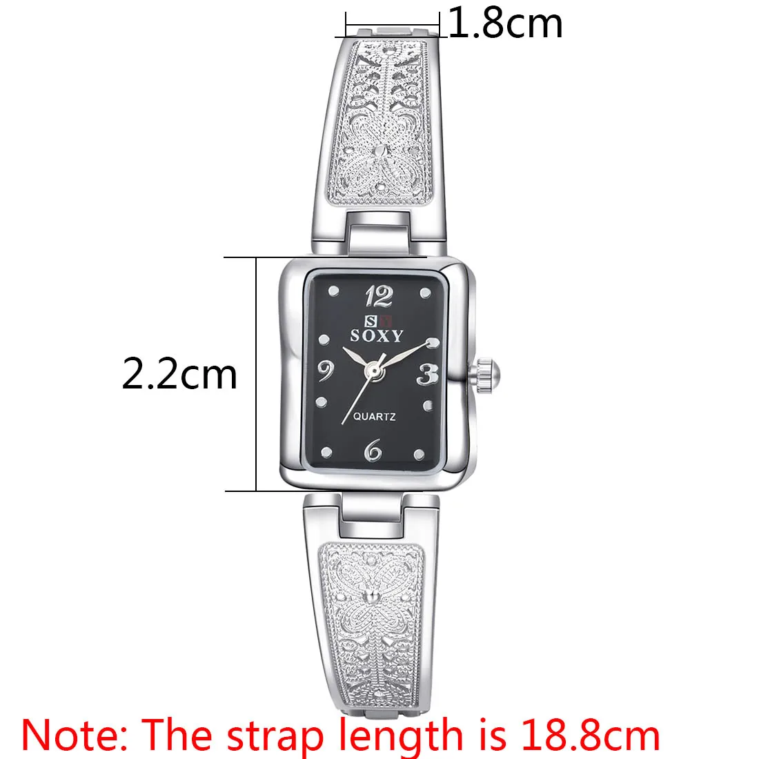 Деликатный женский выбор Хороший подарок для ваших подруг или любимых Особенность: Стиль: Модный и повседневный Материал ремня: нержавеющая сталь Материал корпуса часов: нержавеющая сталь Вид: стекло Вес: 28 г Длина ремня: 18,8 см Ширина ремня: 1,8 см Диаметр циферблата: 2,2 см Толщина циферблата: 0,9 см