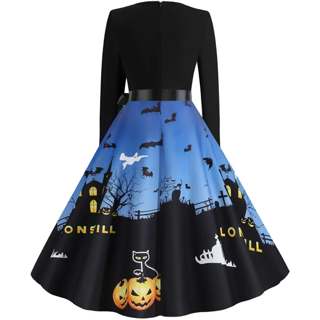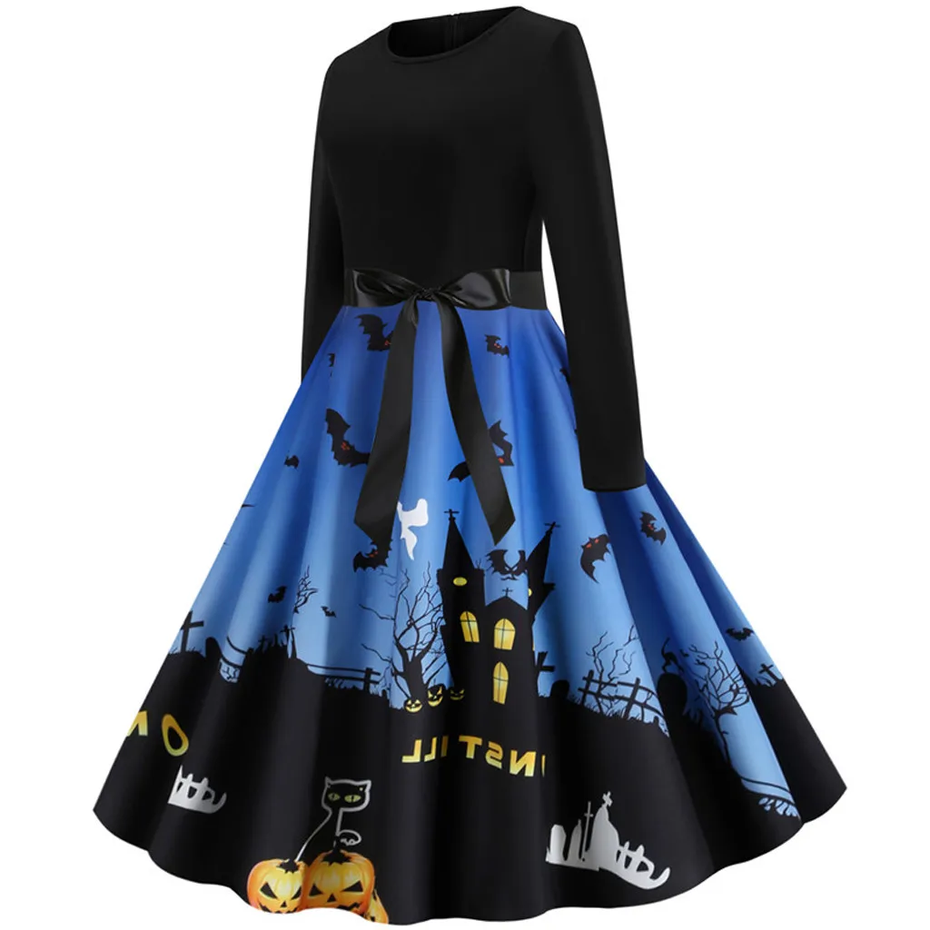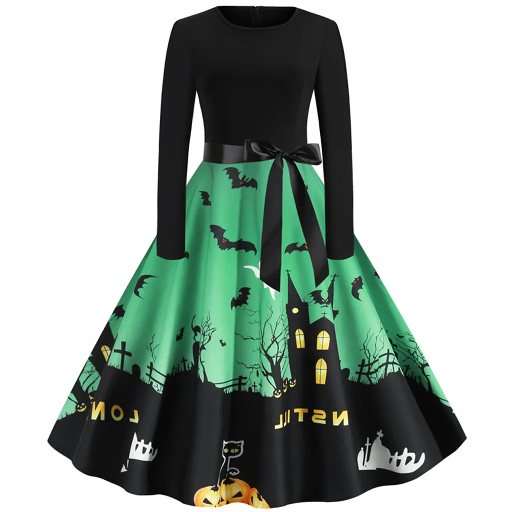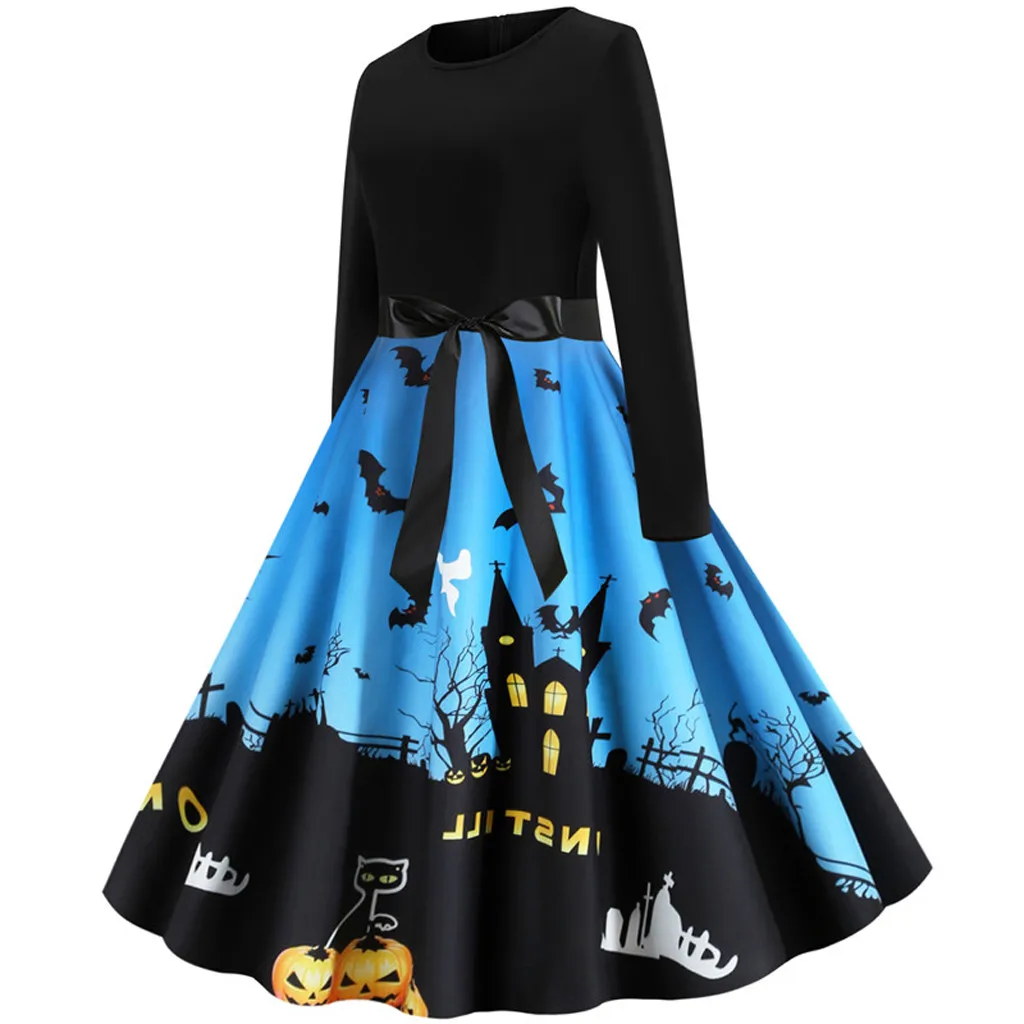 Винтажное платье с принтом на Хэллоуин, в готическом стиле, с высокой талией и расклешенным низом, может показать вашу тонкую талию и теленок, независимо от того, очень красивое пальто или галстук