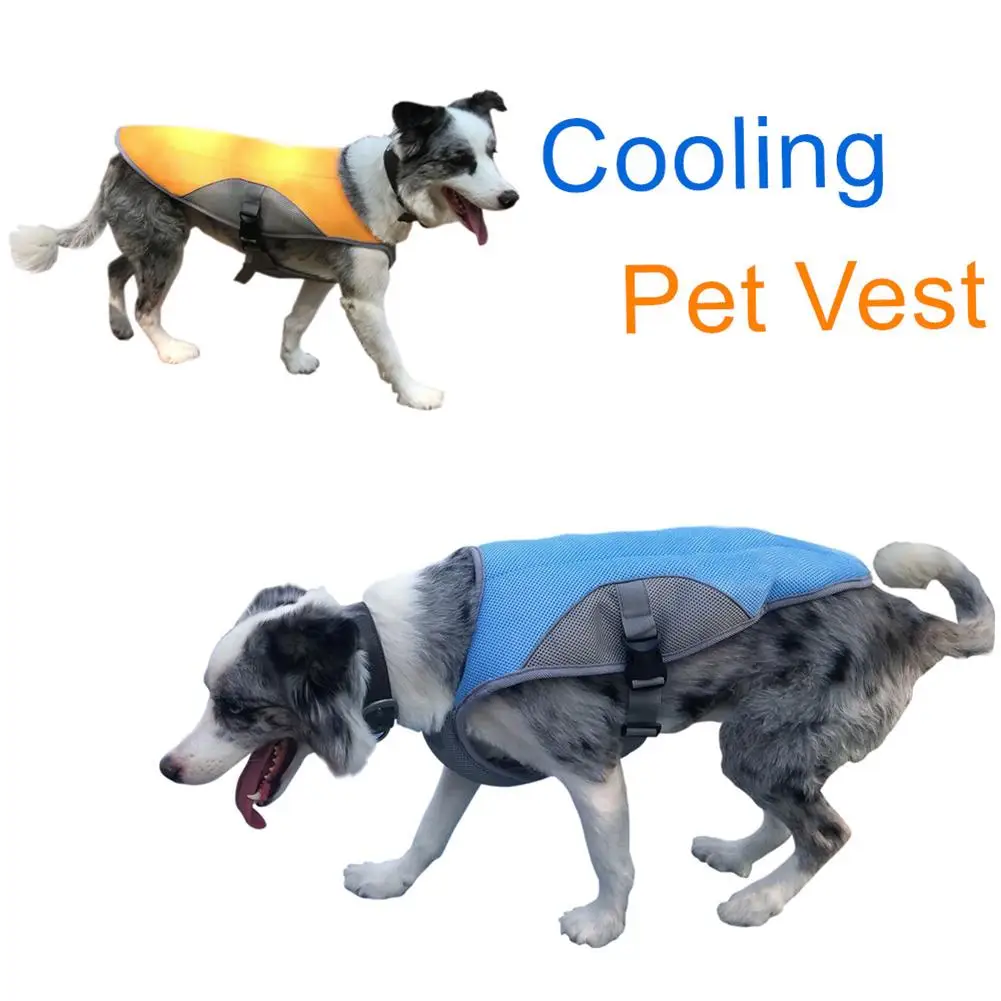 Parameters:Material: PolyesterSize, M, L, XL,Color: blue, pink, orangePacking: oppDog model picture: Model information: Variety: Border Collie Bust: 67cm/26.38in, try on size: LInstructions:1. Wet the vest with water2. Wring out3. Wear on pets4. Please use with the accompany of ownerPS: If it is put into the water, twist it, put it into the freezer for 10 minutes and then take it out. The cooling effect is more obvious.List: 1 * cooling clothesDescription:1.Pet cooling clothes can cool down in summer and keep warm in winter.2.The collar and back reflective strip design makes it safer to walk the dog in rainy weather and dark nights.3.Comfortable material: the surface is breathable mesh, good ventilation, can reduce the heat from the outside; filled with plain cotton, stored moisture through the principle of evaporation and heat absorption, providing a constant source of coolness; close to the pet part is a cool fabric that resists heat and cools down The cool fabric adjusts the temperature by absorbing heat, and the cooling factor gives the pet a cool feeling of comfort.4.A clothes with size adjustable, buckle, and tri-glide design for easy adjustment. 5.The size is complete, suitable for most dogs, summer pets go for walks, sports, climbing essentials.
