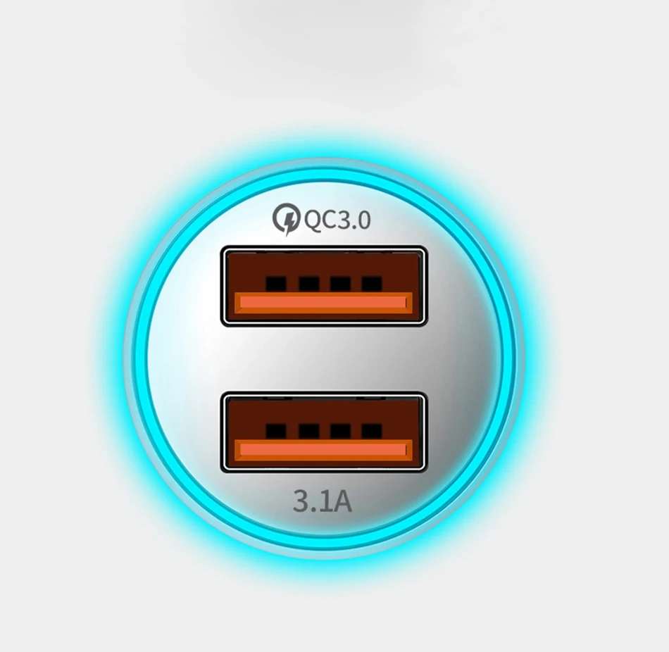 2 порта usb Автомобильное зарядное устройство, быстрая зарядка, максимальный ток 3.1A, порт зарядного устройства автомобиля излучает синий светильник во время зарядки