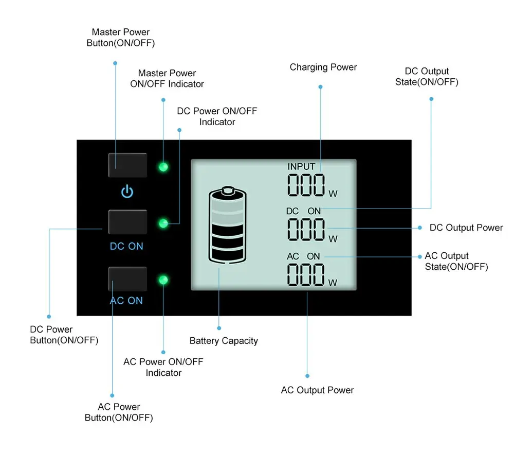 ЖК-экран и кнопки:Поставляется с 3 кнопками с индикатором освещения и 1 большим ЖК-экраном для отображения потребления батареи, заряда и разрядки, нажимает точные кнопки, чтобы изменить различные способы питания