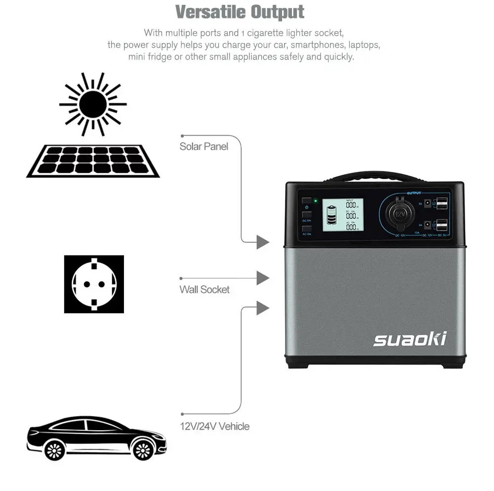 Через долива этот гаджет от сети переменного тока для адаптера переменного тока, ваш автомобильный прикуриватель и даже панели солнечных батарей, Suaoki портативный генератор солнечной энергии поставки резервного питания, представленных на улице и в помещении для наружного использования без шумы и испарения. Это отлично, чтобы взять в свой фургон, кемпинги, рыбалка, охота, фермы или места работы.