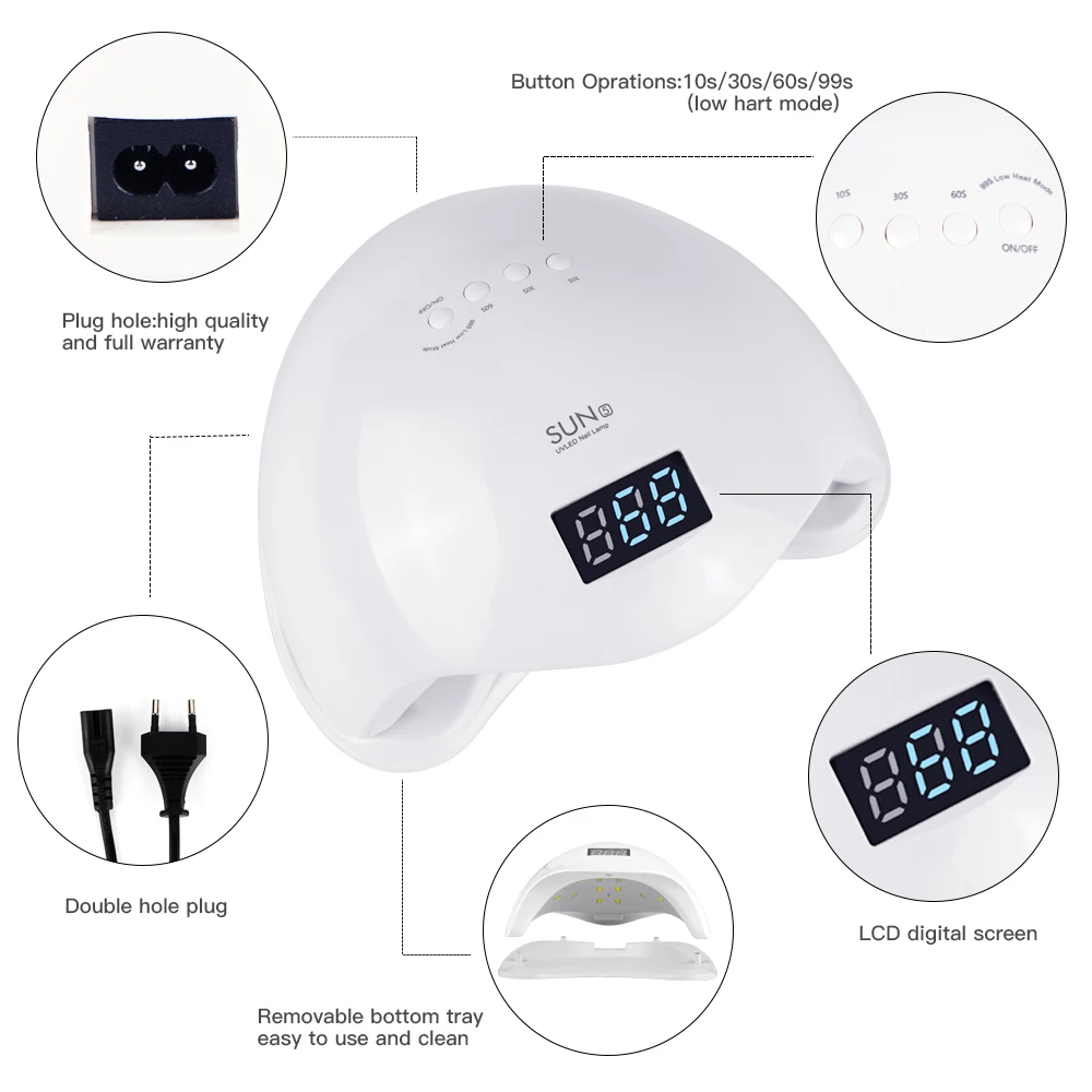 Этот продукт является профессиональной лампой для ногтей. При использовании режима синхронизации 10 s/30 s/60 s, он составляет 72 Вт. В тех случаях, когда вы используете 99 s низкий температурный режим, это машинка для стрижки 48 Вт.