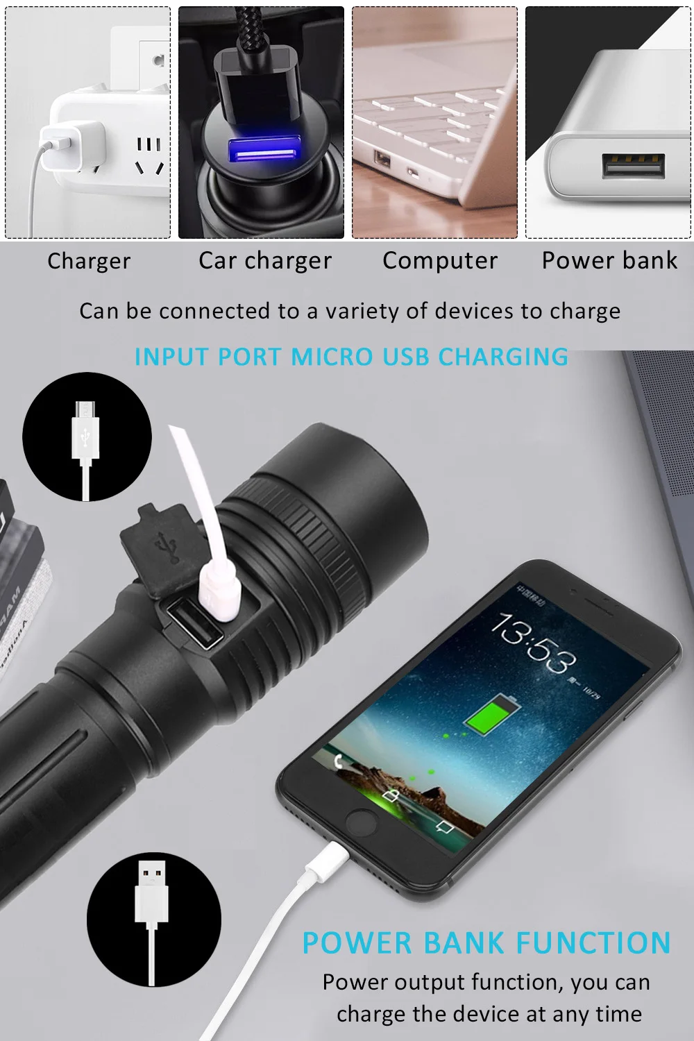 Мощный светодиодный фонарик XLamp XHP50 Дисплей питания, телескопический зум, блок питания Micro usb для компьютера USB, Автомобильный USB, usb-разъем для зарядки, заряжаемый фонарик Изготовлен из авиационного алюминиевого сплава прочный HAIII военный класс Жесткий анодированный Подходит для активного отдыха, таких как езда на велосипеде, кемпинг, путешествия, туризм и путешествия и т. Д. Примечание: он может использоваться только для дождевых дней, но не может использовать дайвинг.