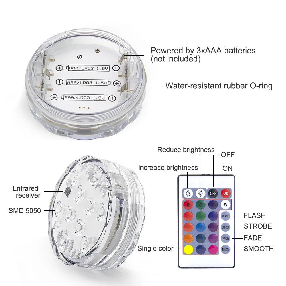 • 10 x втулок погружной светодиодный светильник + 24-кнопочный пульт дистанционного управления(Батарейки в комплект не входят)