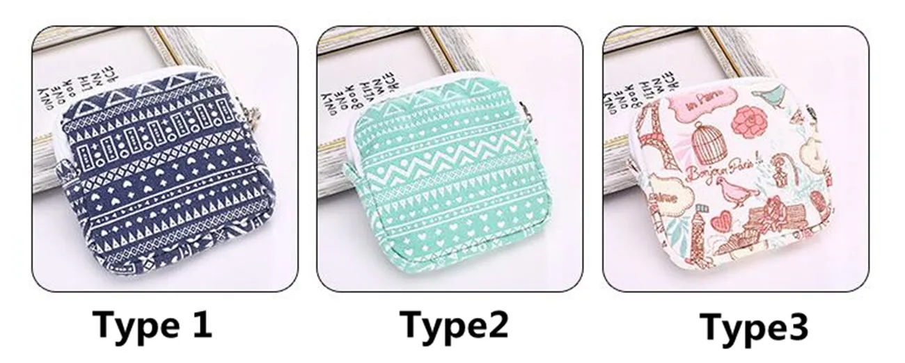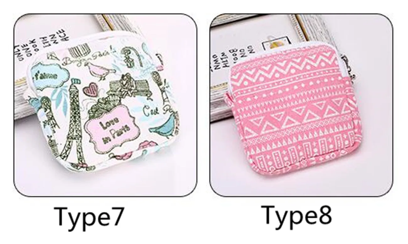 Узор: 8 вариантов Размеры: около 11,5*11,5 см Упаковка: 1 шт. сумки Примечание: Эта сумка не только может держать гигиеническую салфетку, но также может быть сумка для монет, косметичка