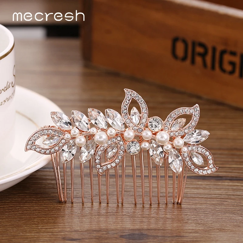 Свадебная расческа для волос Mecresh цвета розового золота, украшение для волос с кристаллами и листьями, свадебные аксессуары для волос с искусственным жемчугом FS295