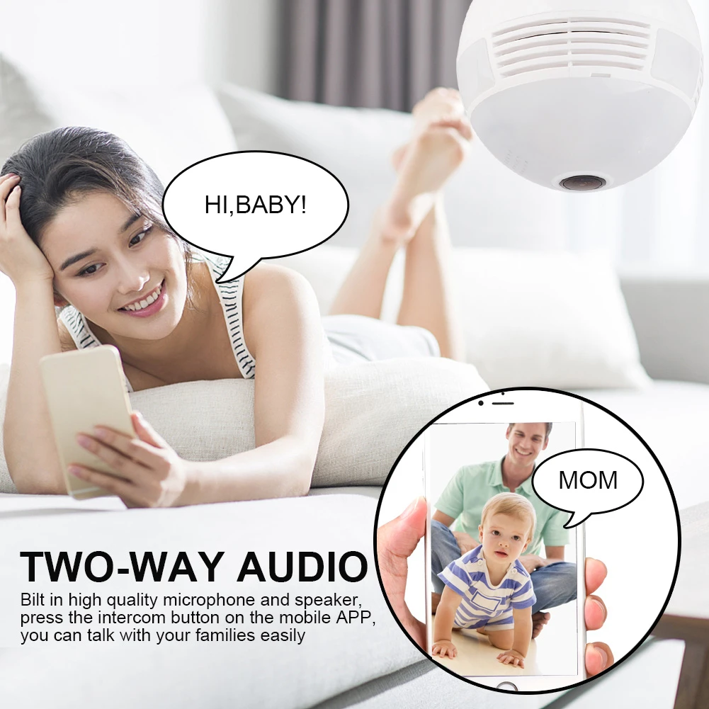 -Панорамная камера 360 градусов со всеми функциями, включая беспроводное подключение, двухстороннее аудио-разговор, слот для sd-карты, обнаружение движения с hd рыбий глаз для разных широкоугольных углов.