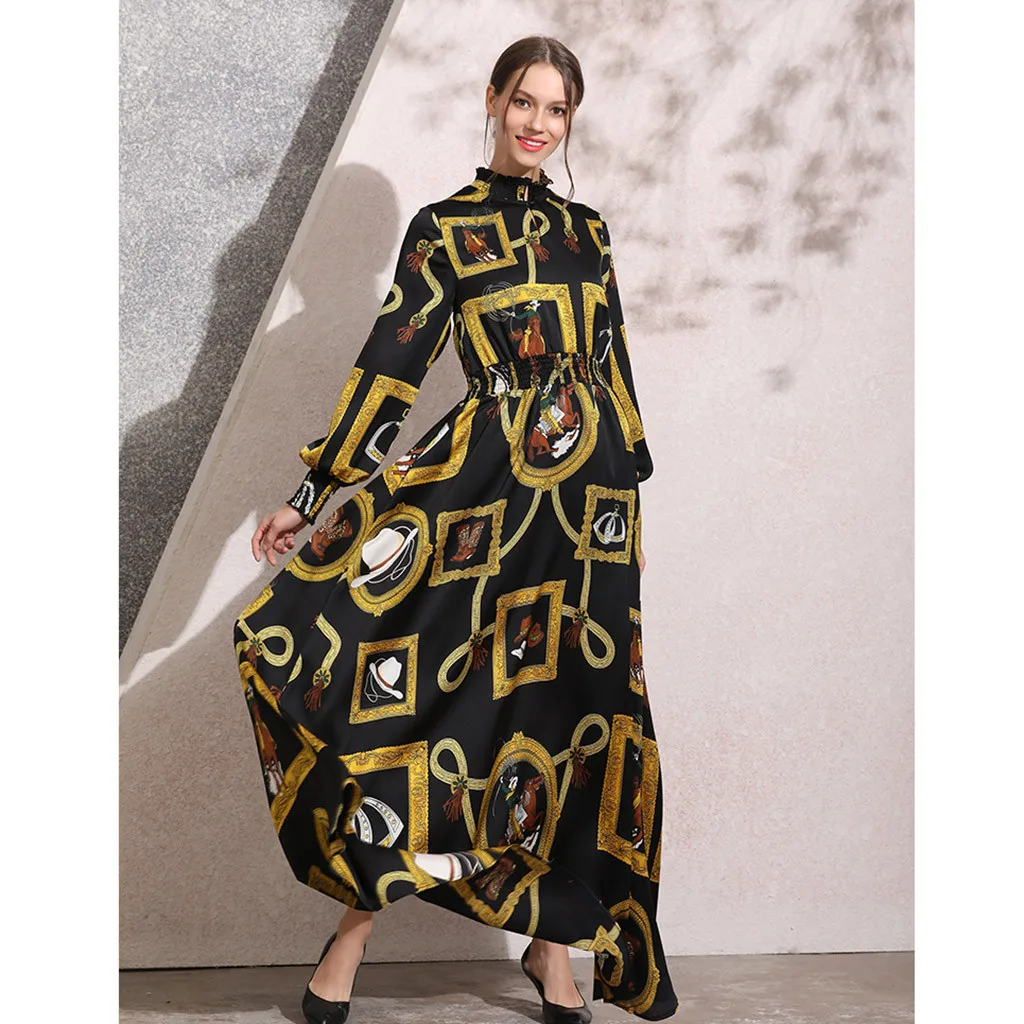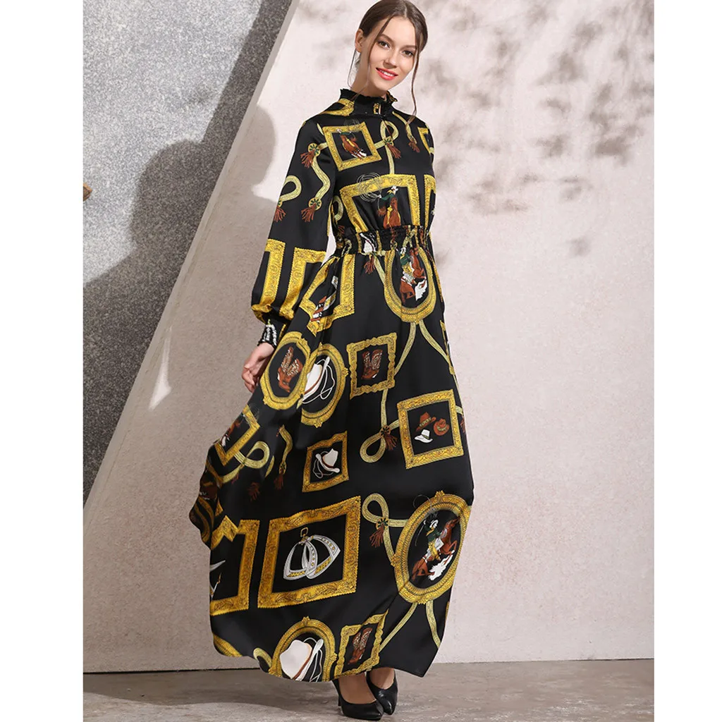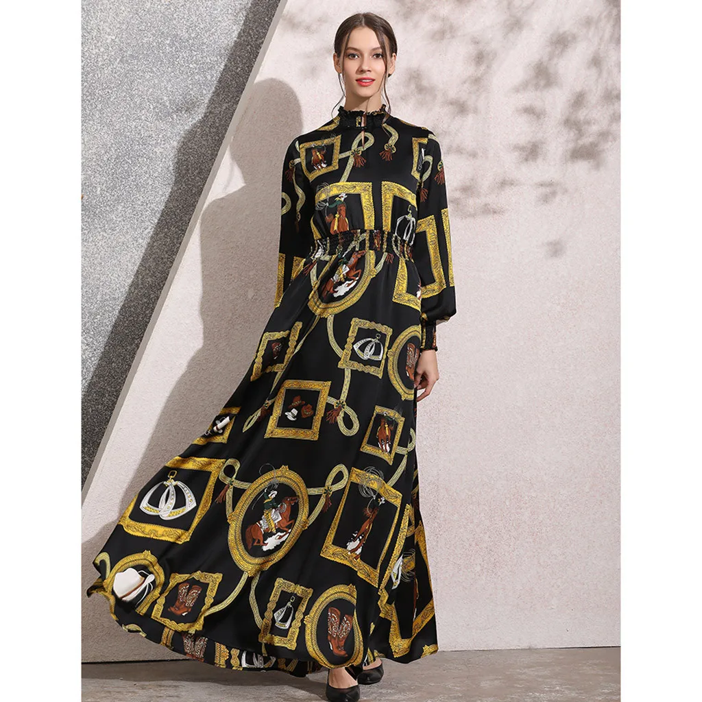 long abaya dress Casual Muslim dress women Fashion Muslim New Simple Retro Print Slim Elastic Waist Silk Dress Long Dress T417