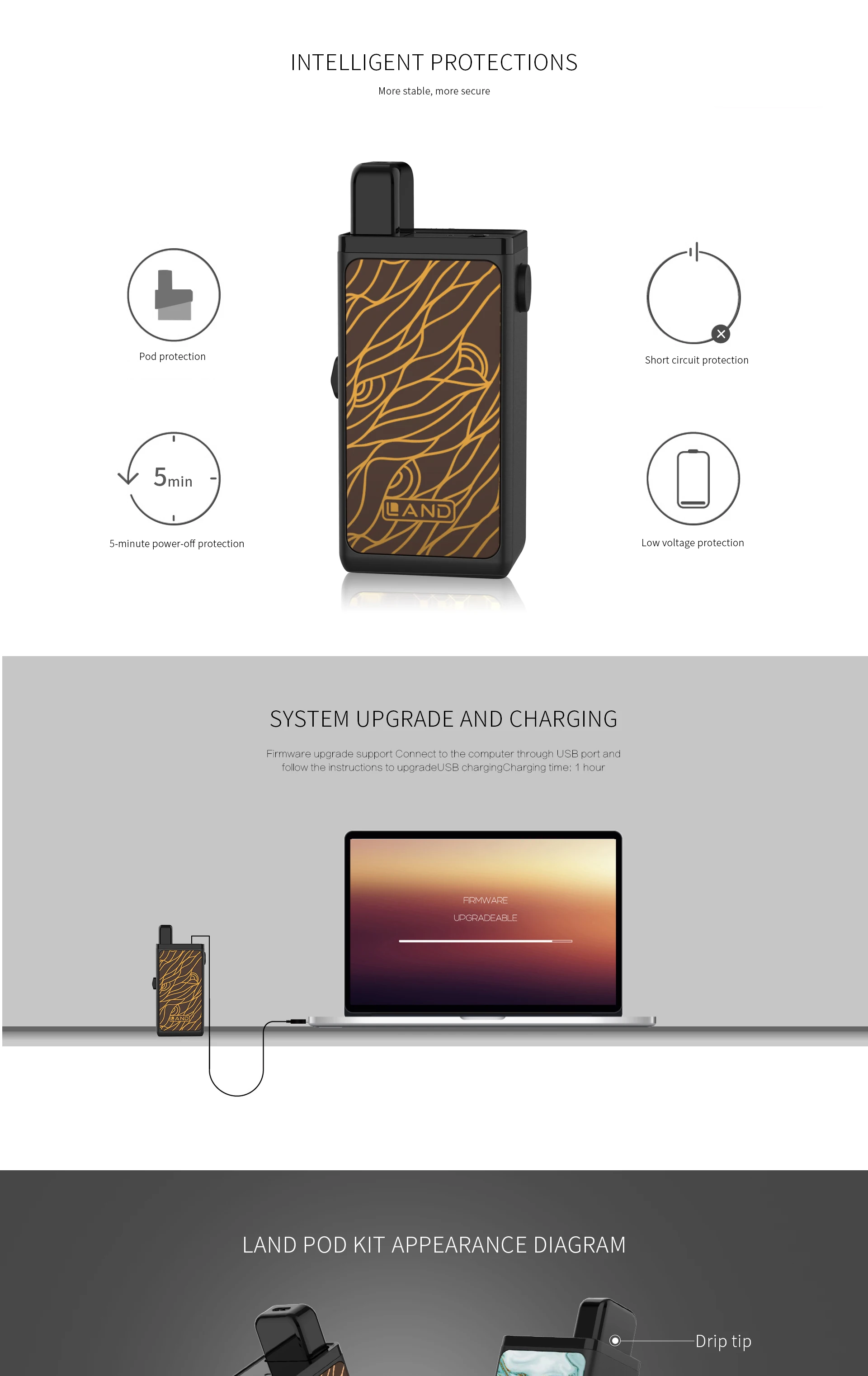 1. One click ergonomic design 2. Intelligent protection,more stable & secure 3. System upgrade and USB charging 4. Adjustable switch to protect pod 5. 5 Colors available