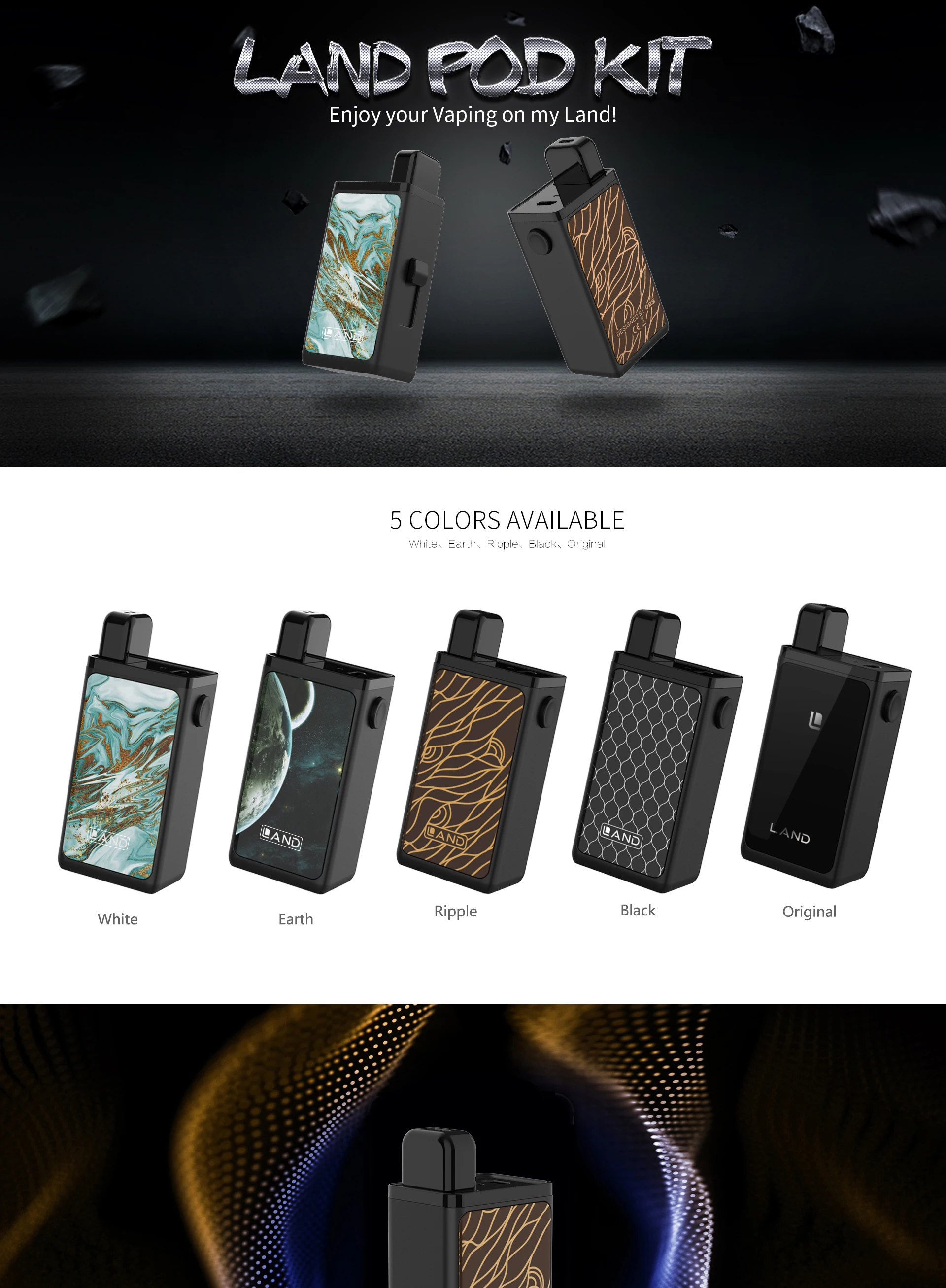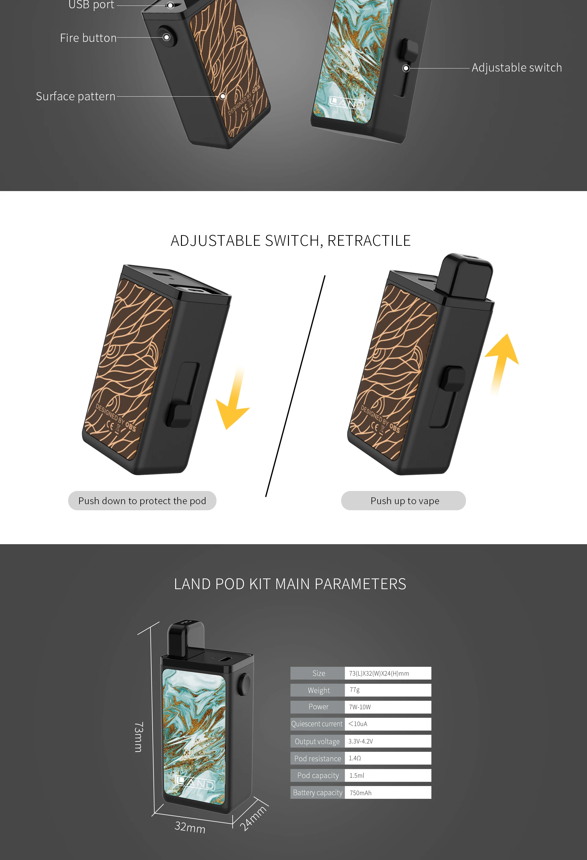 OBS Land Kit powered by built in 750mah big capacity to full charge in 1 hour by upgraded USB charging, and one click ergonomic design makes it easy to operate. Unique adjustable switch to push down to protect the pod and push up to vape. The intelligent protection to provides more stable and secure vaping. Juts enjoy your vaping on OBS Land!