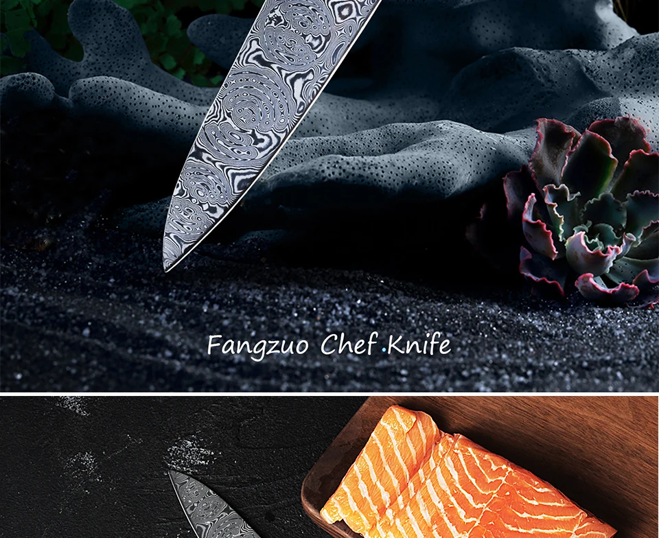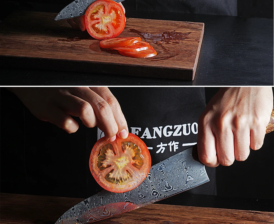 Описание продукта: Название: FANGZUO 8 дюймов лучший профессиональный нож шеф-повара Полная длина: 328 мм (8 дюймов) Длина лезвия: 193 мм Ширина лезвия: 47 мм (самая широкая точка) Толщина лезвия: 2,2 мм Вес нетто: 187 г Твердость: 60 ± 2 HRC. Материал: VG10 Дамасская сталь. Ручка: ручные затвердевшие деревянные ручки, жесткие, термостойкие, красивые, каждая ручка уникальна. Характеристики: острый и прочный; Супер антикоррозийный; Светильник с энергией. Уровень резкости: Острая Бритва Другое: подарочная коробка