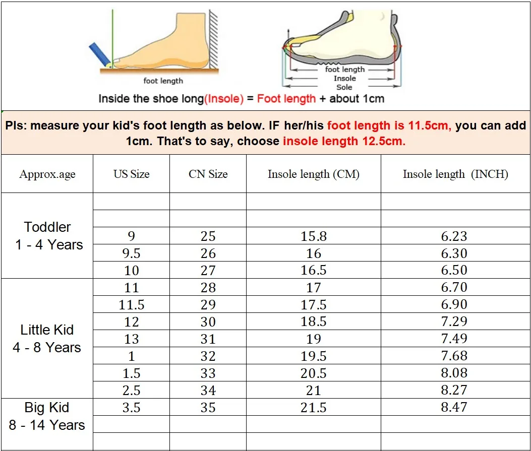 5. Что касается размера, Измерьте длину стопы ребенка в см или дюймах + 1 см или 0,03937 дюймаChВыберите соответствующий американский размер, спасибо