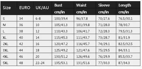 | Размеры::5XL | Евро::48 | UK/AU::22-24 | Бюст (см/дюйм)::135/53. 1 | Талия (см/дюйм)::131/51. 6 | Рукав (см/дюйм)::77/30 образования легкой пены. 3 | Длина (см/дюйм)::87/34 образования легкой пены. 3 |