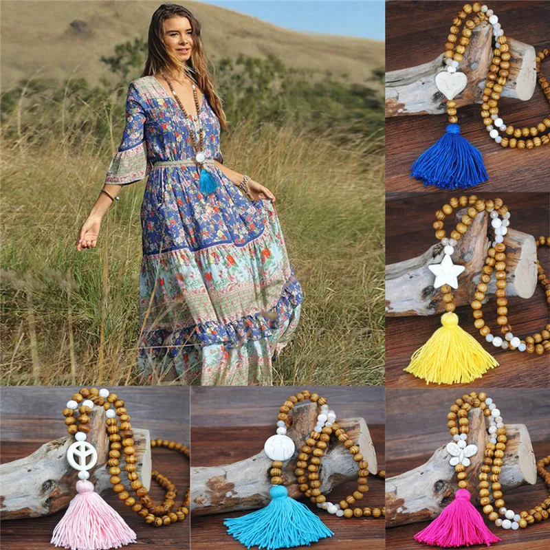 Женские кисточкой деревянные бусы с подвеской богемные цепи ювелирные аксессуары Длинная цепочка под свитер аксессуары костюмы для женщин 5