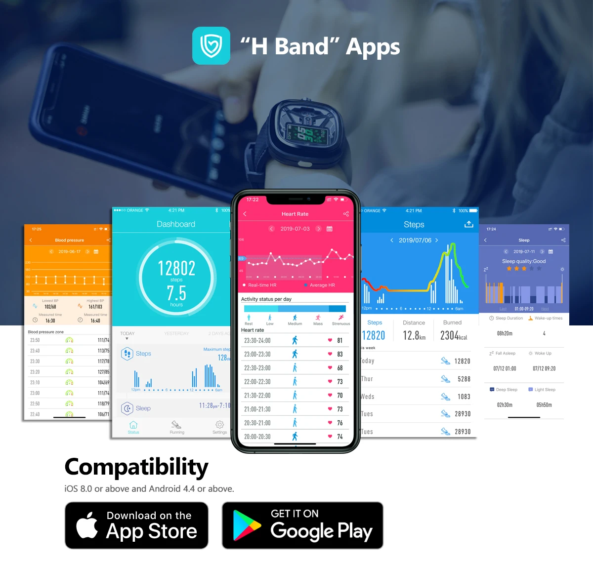 Гибрид 2 автоматически синхронизируется через Bluetooth с бесплатными приложениями H Band, которые доступны для iOS и Android. Смотрите данные о вашем здоровье, просматривайте свои результаты, получайте персонализированные советы и получайте дополнительную мотивацию для достижения ваших целей.