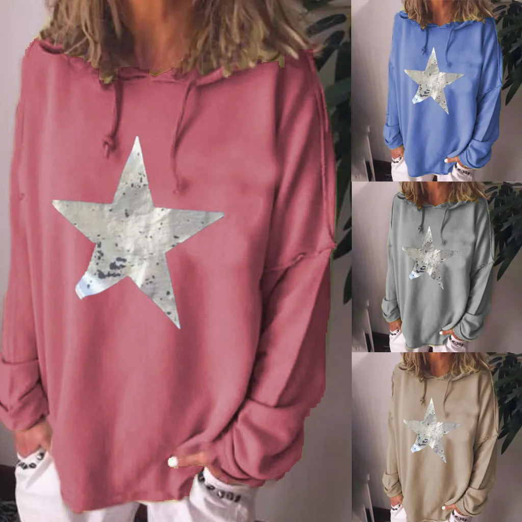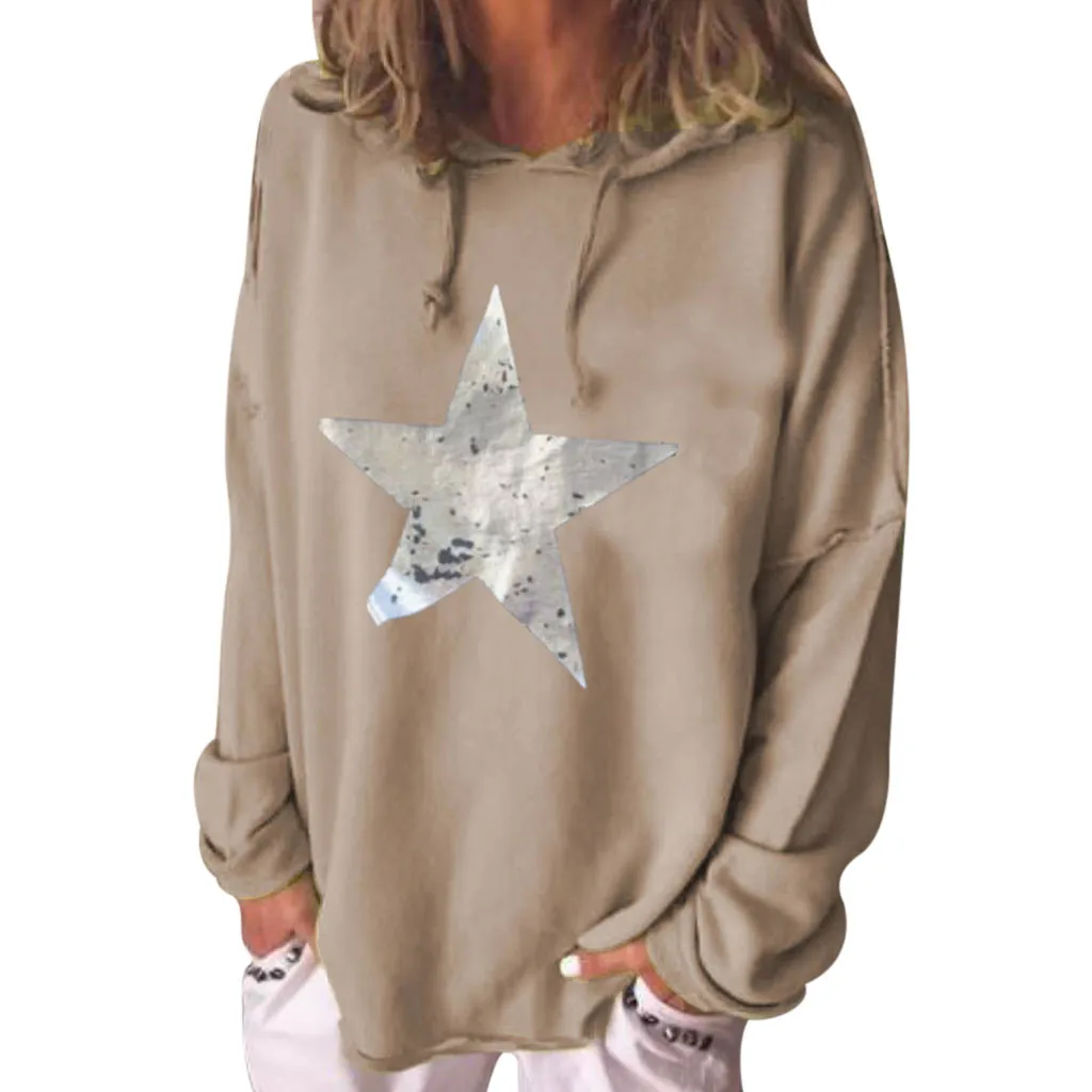 Размера плюс Женская Мода, принт со звездой, свободные Повседневное с длинными рукавами свитер с капюшоном Топ
