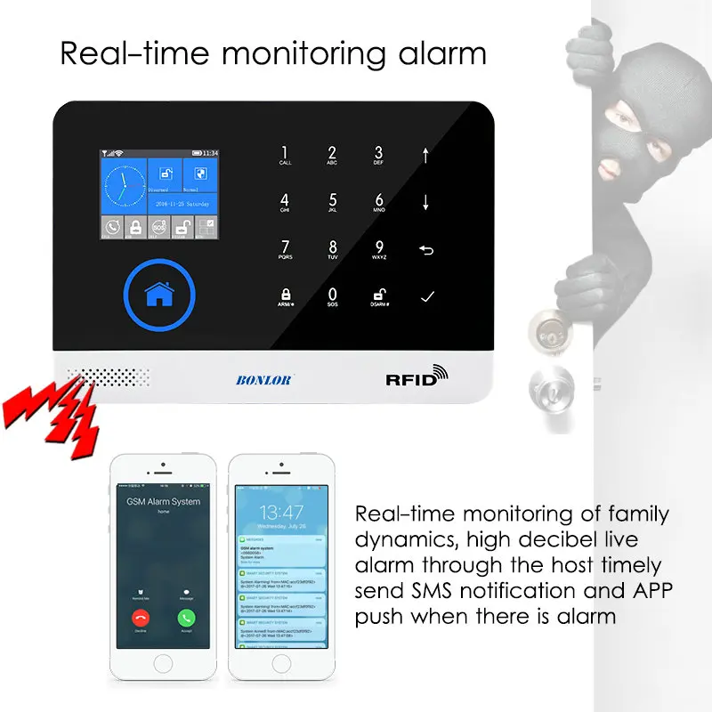 Мониторинг семейной динамики в реальном времени, Высокая децибел livealarm через хост timelysend SMS уведомления и APPpush, когда есть сигнализация
