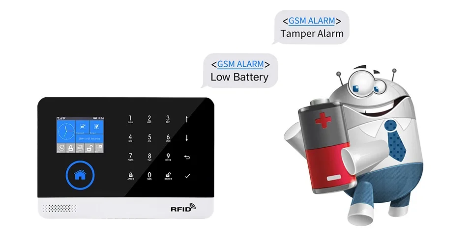 Входное напряжение: DC5V/1A (разъем micro USB) Ток в режиме ожидания: <80uA Рабочий ток: <120мА Выход сирены: <500мА Беспроводная Частота: 433 МГц EV1527 Частота GSM: 850/900/1800/1900 МГц Резервная батарея: 3,7 в/500 мАч литиевая батарея Рабочая температура: 0 ~ 55 ℃