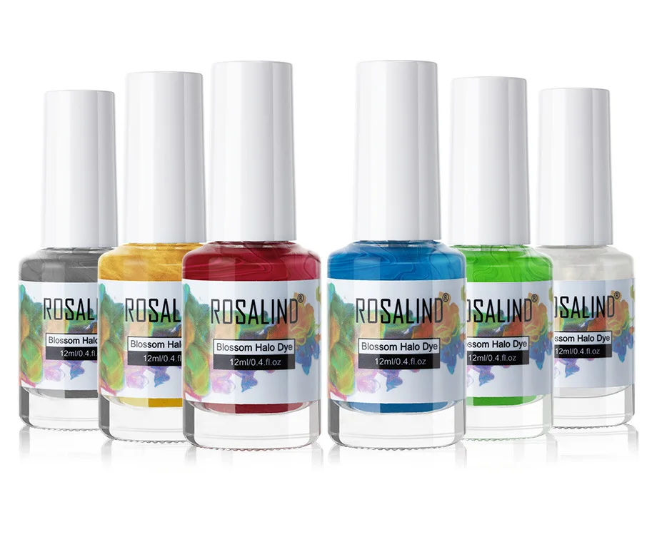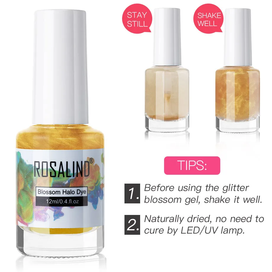Brand: ROSALIND Name: Glitter Blossom Gel Volume: 12ml Color: 6 Colors Feature: The blossom gel has glitter effect Tip: Naturally dried, no need to cure by LED/UV lamp Reminder: The color will be obvious on the black color gel polish. (Especially NO.A566 only can be seen with black color gel polish.)