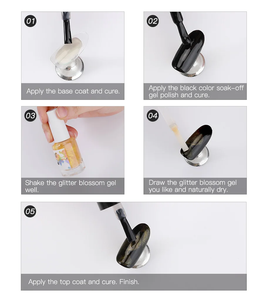 -1. Shape the nail. Lightly buff the surface of the nail plate. Sanitize. -2. Apply a base coat of foundation from the cuticle to the free edge (Remember to seal the edge of the nail). Cure the nails under the LED light for 10 seconds or a UV light for 2 minutes. -3. Apply the black color Soak-Off Gel Polish. Cap free edge. Cure: 30 seconds in LED Lamp, or 2 minutes in UV lamp. -4. Draw the glitter blossom gel you like and naturally dry. -5. Apply a top coat. Cap free edge. Cure:30 seconds in LED lamp. -6. Remove the tacky residue on nails with the cleanser. Then, apply nourish cuticle oil to rehydrate moisture into the cuticle and the skin surrounding the nail.