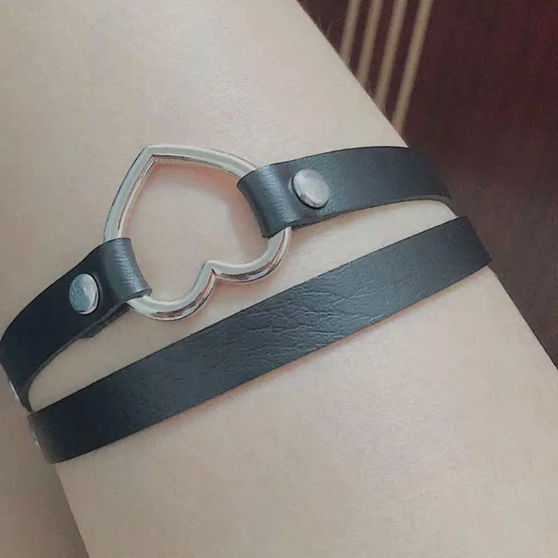 Черная подвязка из искусственной кожи с милым ажурным металлическим кольцом в форме сердца, 2 ряда ремня из искусственной кожи.