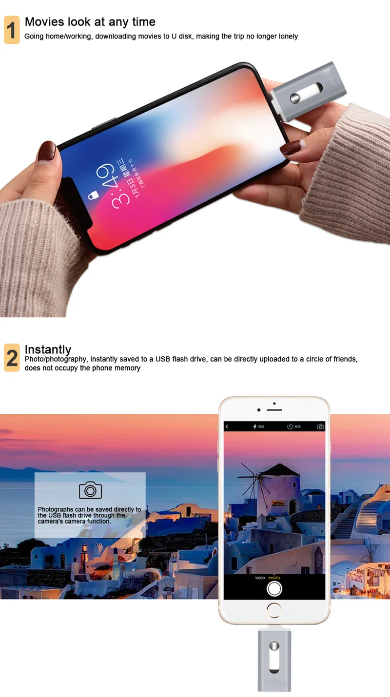 Совместимость с: Для IOS: для iPhone5/5S/5c/6/6 plus/6 S/6 S plus/7/7 Plus/8 plus/X Для iPad4/Air/Mini/Mini2 Для Android: для samsung S3/4/5, для Note2/3/4 и так далее Особенности: 1. Внешнее расширение для IOS/Android/PC. 2. Оснащен USB3.0. 3. Поддержка шифрования файлов. 4. Поддержка управления данными напрямую. (Создавать, копировать, перемещать, удалять, менять, открывать и так далее) 5. Поддержка воспроизведения видео/музыки непосредственно. 6. Поддержка резервного списка контактных данных. 7. Поддержка форматов: общий формат изображения, такой как MP3, MP4, Mov, MPEG-4, flv, RM, RMVB и другие видео и аудио Формат. Максимальная поддержка 1080 p. Mp4 видео формат. 8. Поддержка копирования файла формы mobile HD. Поддержка файлов шифрования/дешифрования HD 9. HD хорошее оборудование для тв-вентилятора, HD видео, lossiess любителей музыки. 10. Пожалуйста, загрузите приложение перед использованием. О Ёмкость: 4 ГБ = приблизительно 3,6-3,8 ГБ 8 ГБ = Приблизительно 7,4-7,6 ГБ 16 ГБ = Приблизительно 14,4-14,8 ГБ 32 гб = приблизительно 28-29 гб 64 ГБ = приблизительно 58-59 ГБ 128 гб = приблизительно 115-120 гб 256 ГБ = приблизительно 230-238 ГБ Это разница в расчетах между производителем и нашим ПК, только для справки. Для получения дополнительной информации, пожалуйста, найдите в Google «емкость карты памяти».