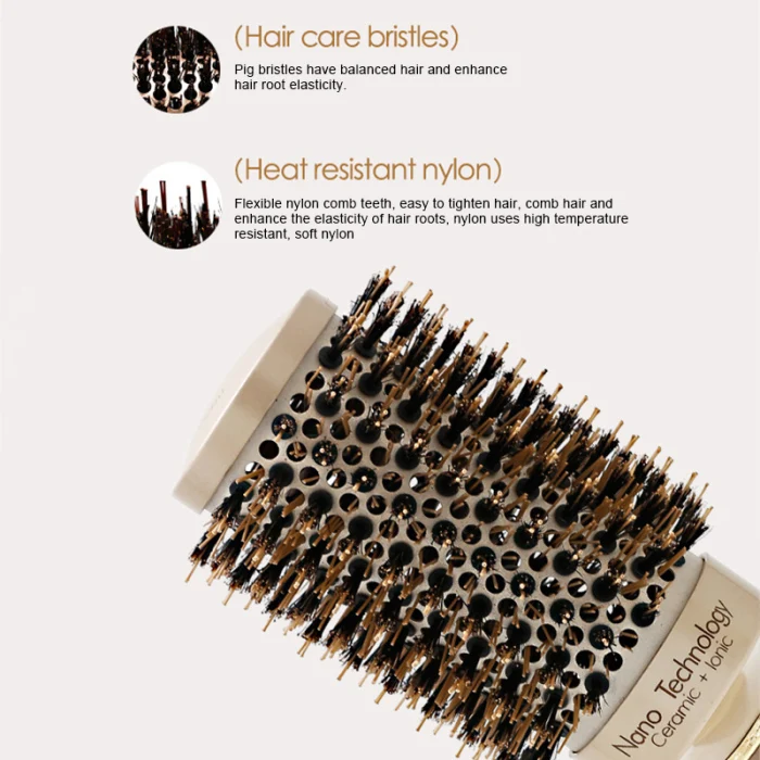 Ионная технология и щетина кабана:Благодаря термокерамической ионной технологии в бочке и щетине Эта круглая щетка для волос поможет добавить волосам блеск и уменьшить вьющиеся. Наша щетина кабана с добавлением нейлоновых штифтов, не повредит ваши волосы и сделает волосы гладкими и блестящими.
