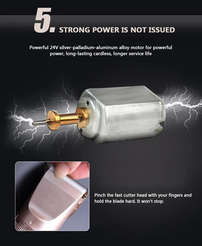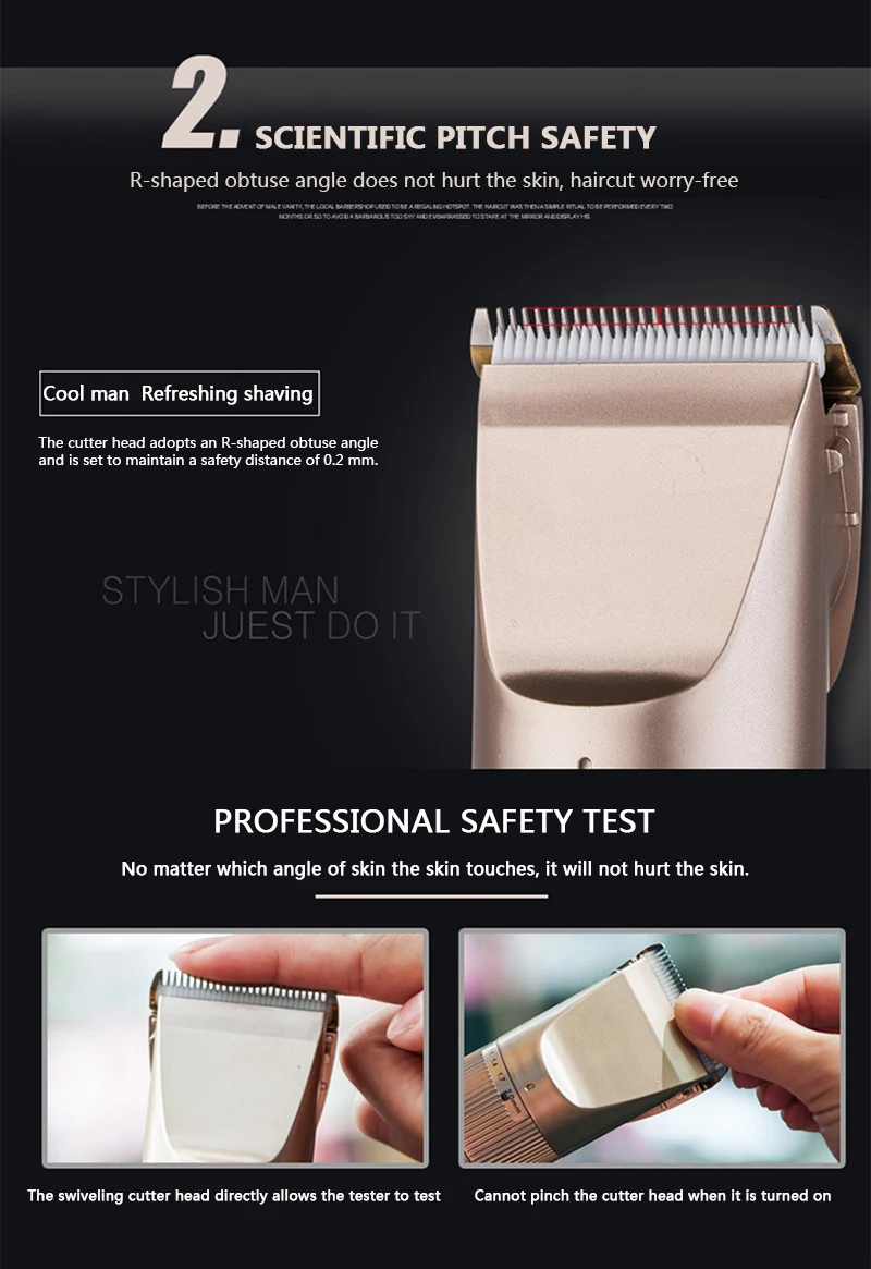 1: Высокоэффективная остроугольная поверхность режущей головки 2: научная безопасность и душевное спокойствие 3: профессиональный тест безопасности 4: 5-регулятор скорости тонкой настройки 5: новички также могут легко стричься 6: сильная мощность не выдается 7: USB зарядка, различные способы питания, более удобный