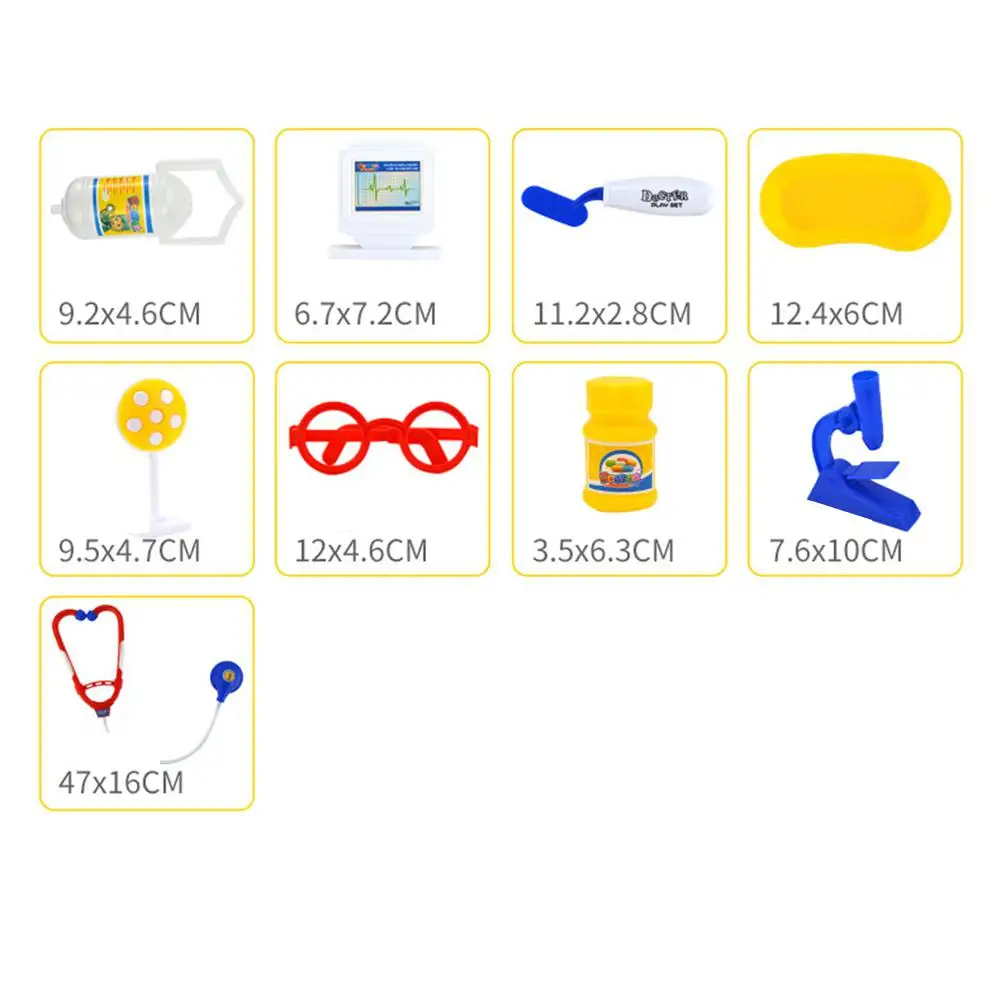 Стетоскоп * 1 + очки * 1 + поднос * 1 + медицинская лампа * 1 + дисплей электрокардиограммы * 1 + Микроскоп * 1 + бутылка для таблеток * 1 + Скорпион * 1 + шприц для языка * 1 + инжектор * 1 + коробка для таблеток * 1 + подвесная бутылка * 1 + значок * 1 + термометр * 1 + зеркало * 1 + отоскоп * 1 + молоток нерва * 1 + хирургические щипцы * 1 + ножницы * 1 + скальпель * 1 + медицинская ложка * 1