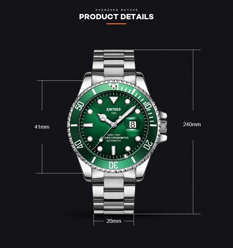 Фирменное наименование: KINYUED Пол: Для мужчин Механизм: японский механический Глубина водонепроницаемости: 3 бар Материал ремешка: нержавеющая сталь Диаметр корпуса: 42 мм Ширина ремешка: 20 мм Форма корпуса: круглая Особенности: Водонепроницаемость Тип застежки: кнопка скрытая застежка Тип материала окна циферблата: Hardlex Посылка список: Часы-1 шт.