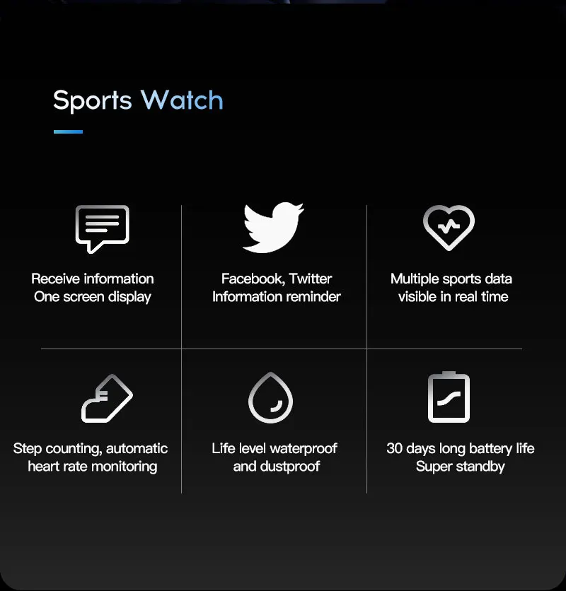 Теплое напоминание> 1. Система поддержки приложений: Android 5,0 и выше, IOS 9,0 и выше. 2. Не используйте зарядное устройство выше 5 В/2 А. 3. Данные не могут быть использованы в качестве медицинской справки. Особенности> * Полный шрифт язык сообщения push * Цветной экран HD 0,96 * Динамический интерфейс 3D UI * Мониторинг сердечного ритма * Мониторинг Артериального Давления * Спортивный режим: walk/skip/situp * Шагомер шаг подсчета * Потребление калорий * Расход расстояния * Мониторинг сна * Напоминание о звонке * Напоминание о тревоге * Удаленная камера * Обмен данными в социальных сетях (WeChat, QQ, Facebook, Twitter) и т. Д.