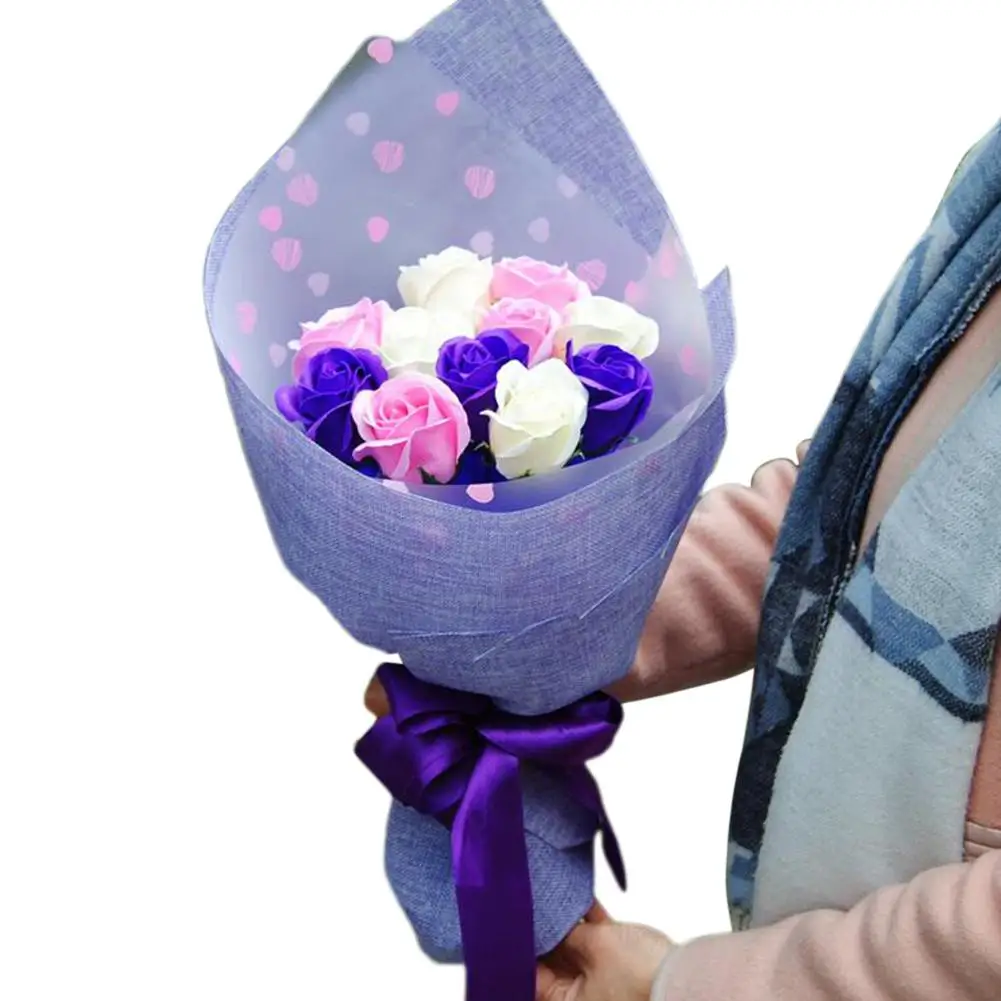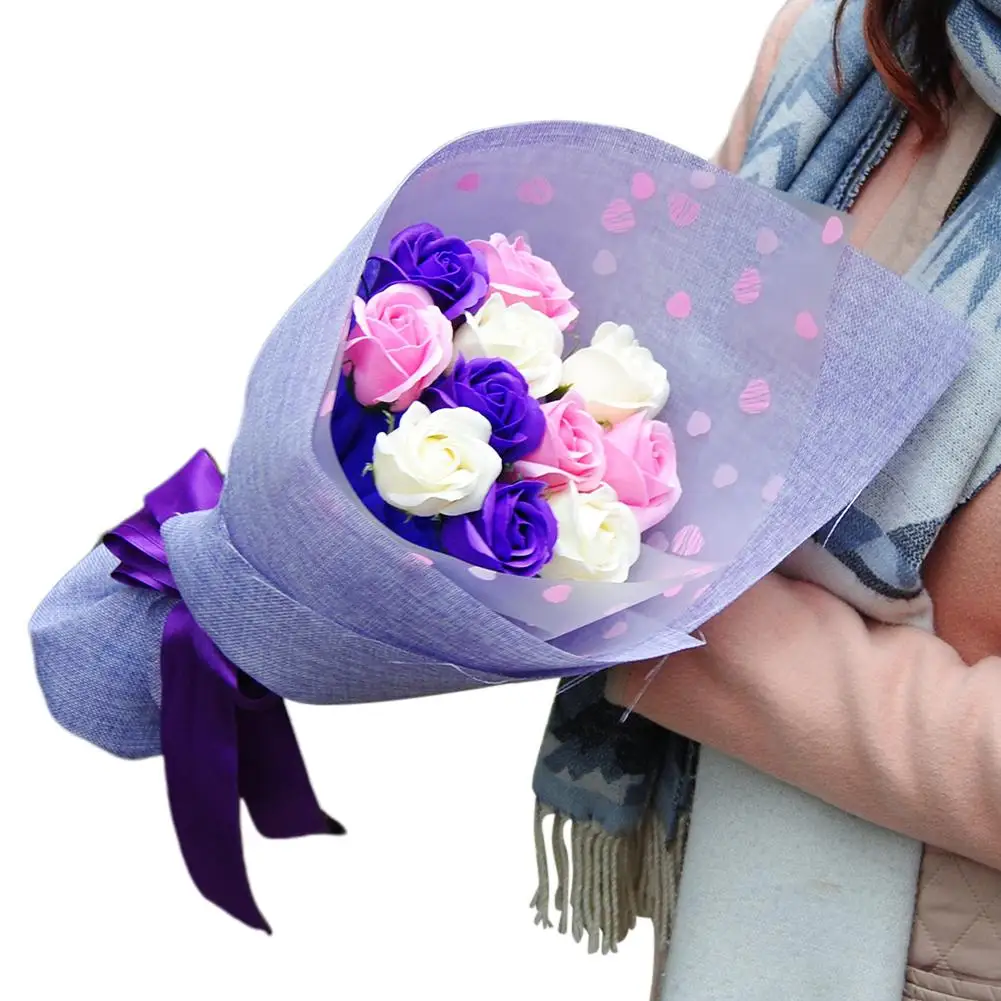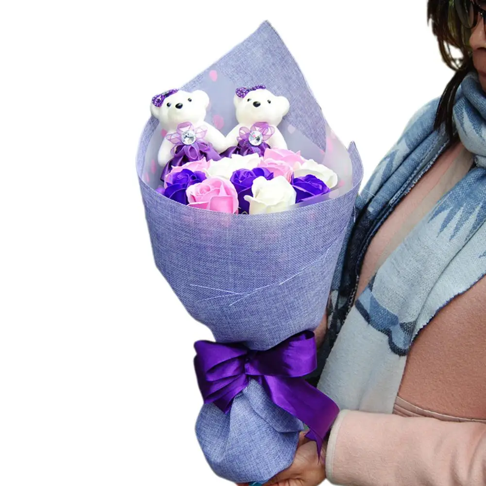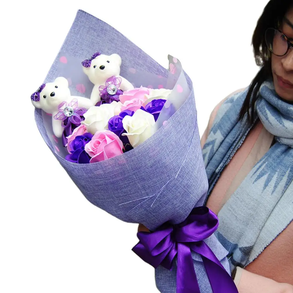 Цвет: 11 розово-фиолетовых мыльных цветов 2 пенопласта для мороженого с медвежонком фиолетового льна упаковка, 11 розово-фиолетовых белых мыльных цветов фиолетовая льняная упаковка;
