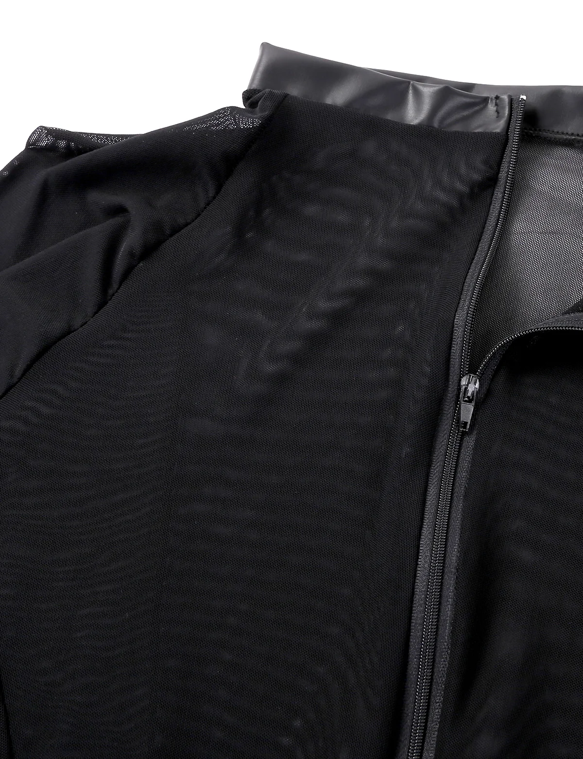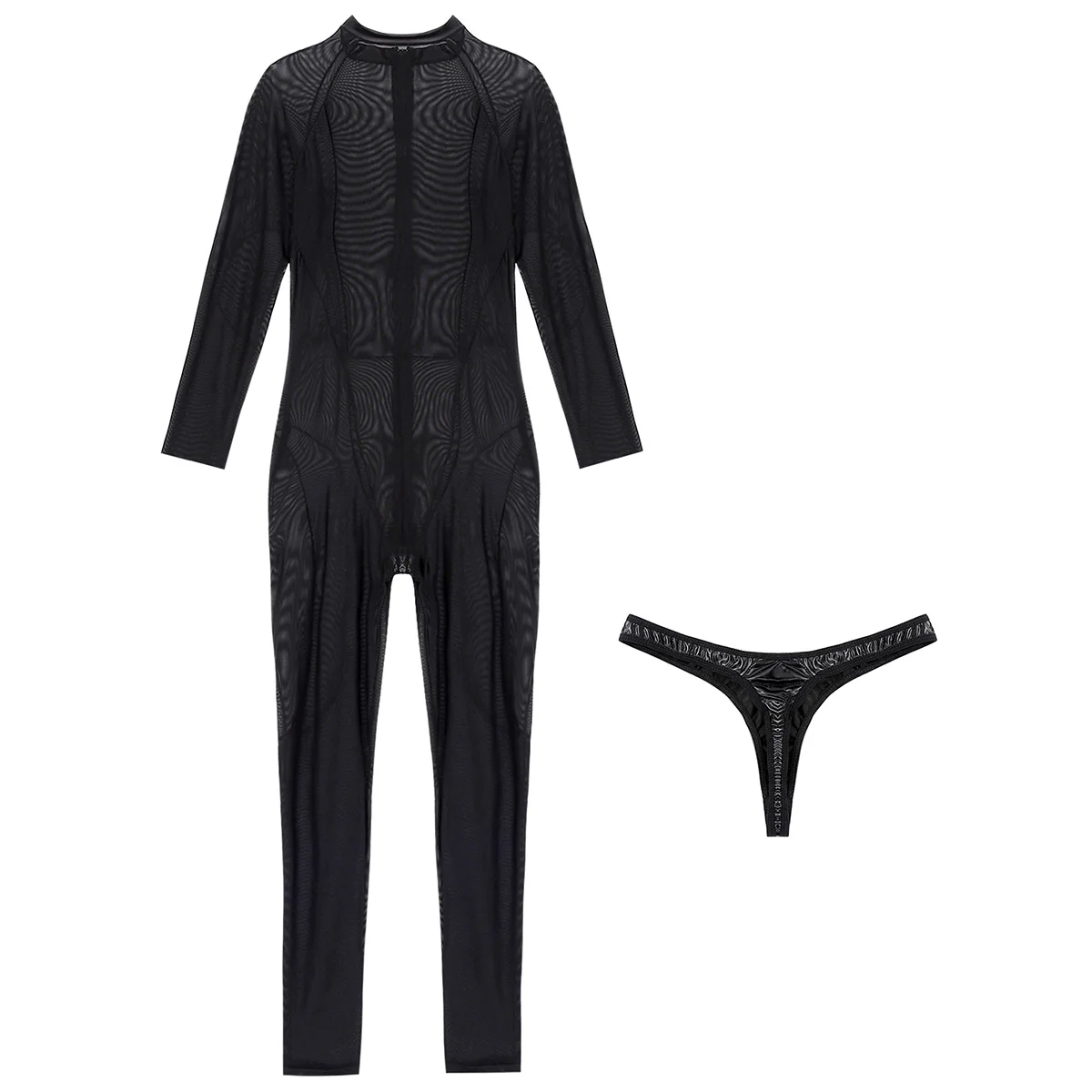Круглый вырез и длинные рукава, просвечивается через прозрачную сетку, спереди молния для легкой одевания. Подходящие Трусы-стринги из искусственной кожи; Нижнее белье.