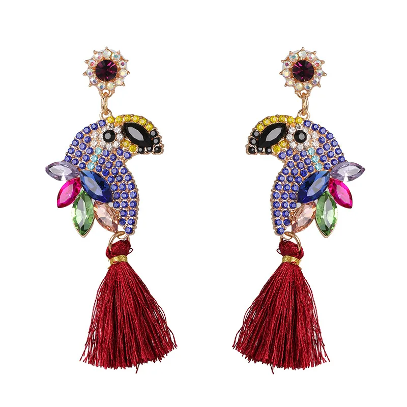 Модные хрустальные серьги-подвески с животным попугаем и кисточками для женщин, стразы, эффектные Красочные Висячие серьги, вечерние серьги в подарок