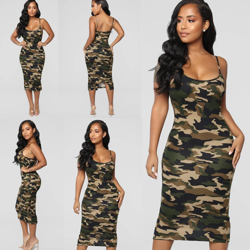 Сексуальное женское летнее платье без рукавов на бретельках камуфляжное
