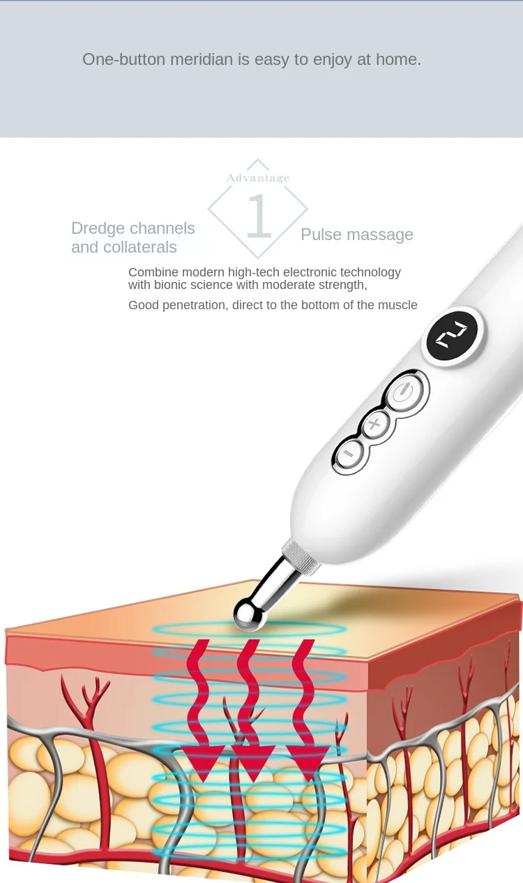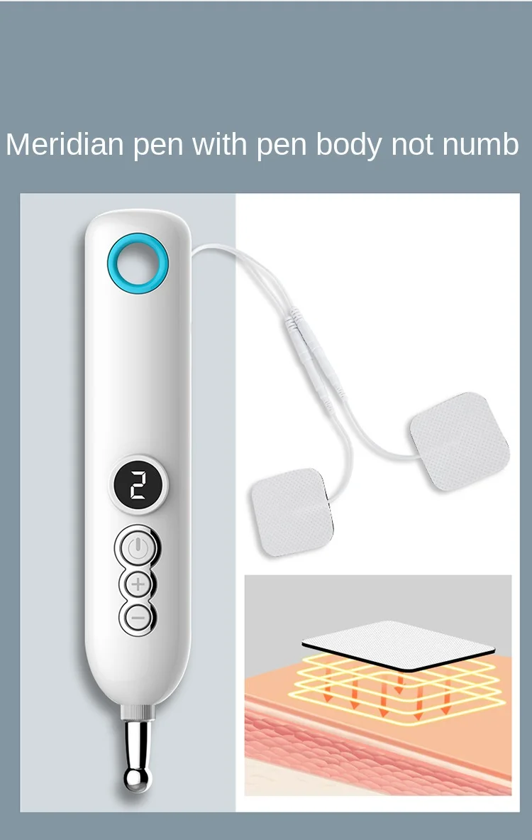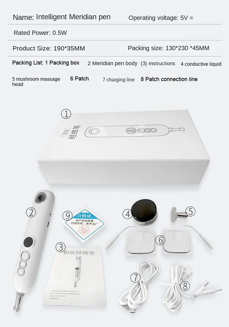 Особенности интеллектуального меридианового пера: драгирование меридианов, импульсный массаж; Интеллектуальный дисплей, зондирование исследований и разработок; Девять передач интеллекта, регулировка пульса; Массаж пластырей, простая операция