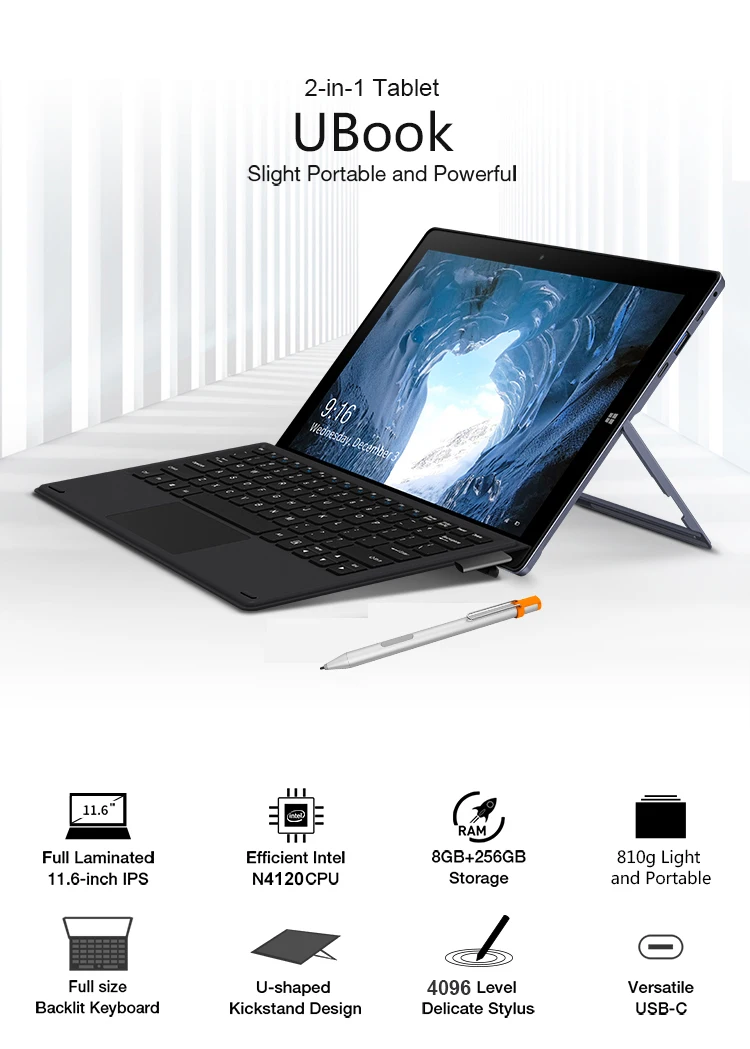 Basicinformation | Brand: CHUWI Model:Ubook OS:Windows 10 CPU:Intel Gemini-Lake, N4120 Core: Quad Core Up to1.1GHz-2.4GHz GPU: Intel® UHD Graphics 600 , 700MHz Material:MetalBody Color: Silver Grey |