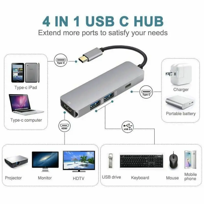 Особенности: 1,4 в 1 Многофункциональный --- этот Тип-C кабель поставляется с USB-C для зарядки, 2 порта USB 3,0 и 4k порт для HDMI, который легко расширяет ваши устройства USB C и выполняет ваше ежедневное использование. 2. Высокое разрешение и супер скорость --- он может расширить экран и достичь максимального разрешения для HDMI 4K ( 3840x2160P)30 Гц. Супер скорость достигает 5 Гбит/с, что достаточно быстро для передачи данных 3. Высокая технология --- изготовлен из высококачественного алюминиевого сплава и измельчается с точной точностью, этот концентратор отличается более быстрым рассеиванием тепла. Он в основном предназначен для чтения дополнительного устройства USB/выхода для HDMI 4. Компактный и совместимый --- этот концентратор предназначен для простого в использовании. Просто подключи и работай. Дополнительная установка или программное обеспечение не требуются. Подходит для всех новых MacBook, DELL XPS15, HP Spectre X360, Chromebook, Samsung Tablet и Huawei Matebook 5. Качественный дизайн --- он маленький, компактный и чудесный для путешествий и анестезии Аксессуар изготовлен из прочного алюминиевого каркаса Спецификация: Тип: Dada кабель передачи, концентратор/сплиттер разъем коробки (ы):Type-C, для HDMI Особенности: портативная Тема: дома в комплекте: пакет в комплекте включает: 1 x USB-C концентратор примечание: из-за разницы в экране цвет может немного отличаться от того, что вы ожидаете, пожалуйста, позвольте