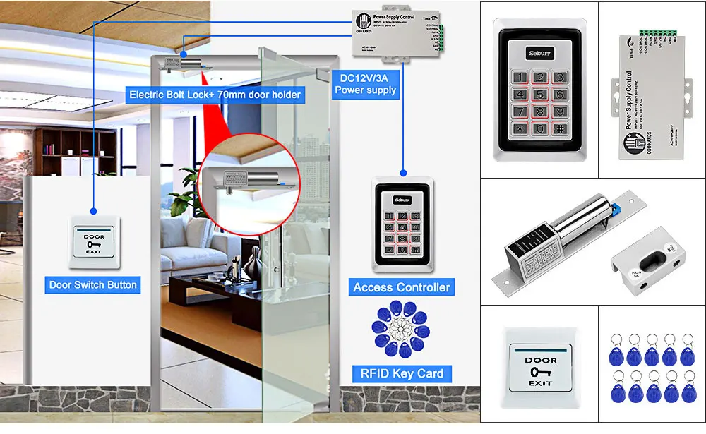 Клавиатура контроля доступа * 1 Источник питания * 1 Электрический Болт-замок * 1 70 мм дверной держатель * 1 Выход двери * 1 RFID Брелки * 10 (бесплатно) Руководство пользователя * 1