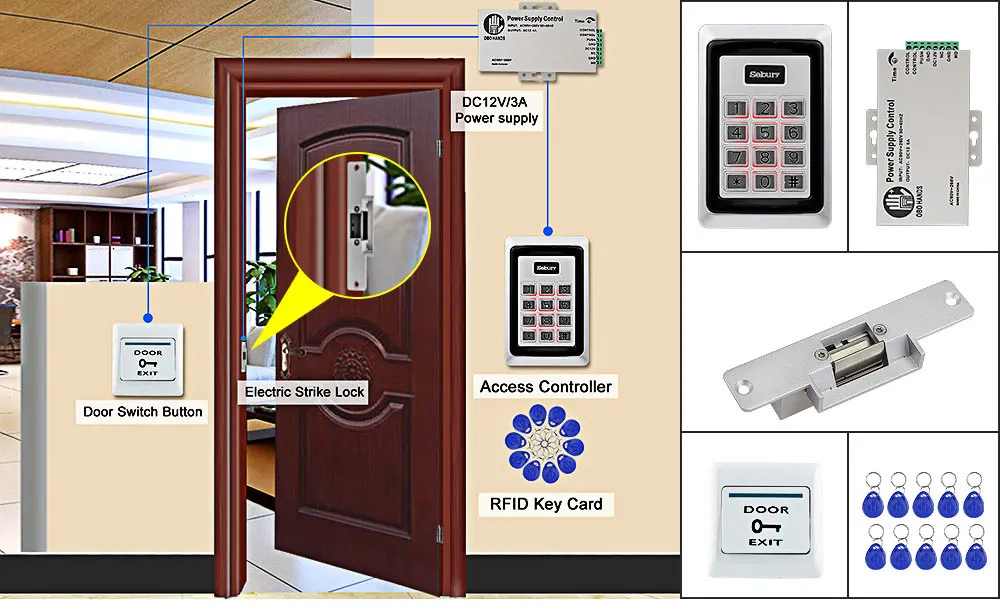 Клавиатура контроля доступа * 1 Источник питания * 1 Электрический ударный замок * 1 Выход двери * 1 RFID Брелки * 10 (бесплатно) Руководство пользователя * 1