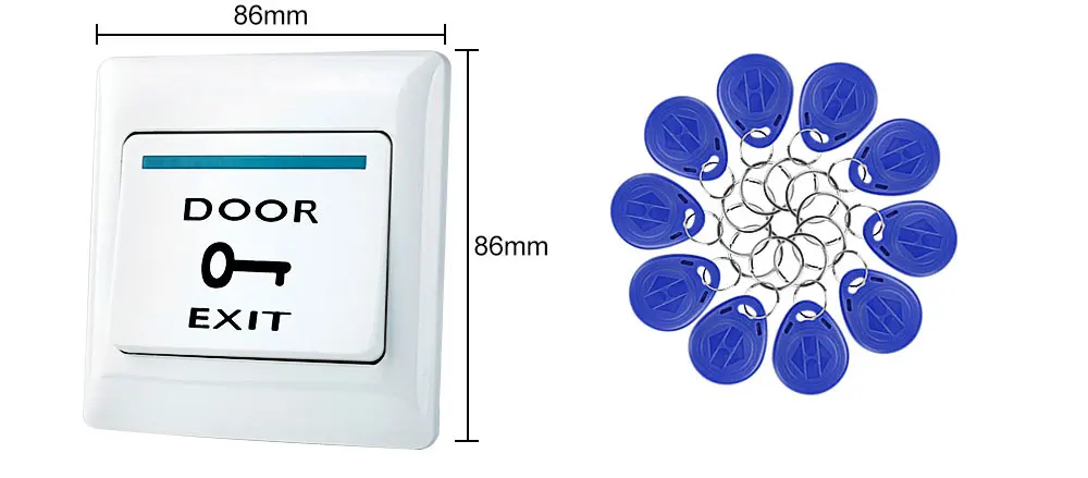 Кнопка выхода двери Материал: жесткий пластик Максимальная мощность: 36 В DC 3A-5A выход Поддержка как режима NC (безопасный режим сбоя), так и режима NO (Безопасный режим сбоя) Размер: 86x86мм (Д/Ш) 125 кГц RFID брелоки Материал: АБС-пластик Рабочая частота: 125 кГц Чипсет: Чип TK4100 Диапазон обнаружения: 0-10 см Цвет: синий, черный, красный, желтый, зеленый (но, пожалуйста, обратите внимание, мы отправим синий цвет по умолчанию. Если вам нужен другой цвет, пожалуйста, оставьте нам сообщение.)