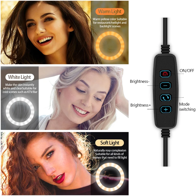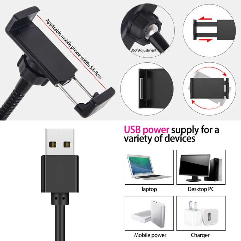 Особенности: Светодиодный кольцевой светильник с регулируемой яркостью и широким диапазоном затемнения от уровня-1 до уровня-10. Светильник источник света: светодиодный Светодиодный светильник: 80 шт. Внешний диаметр: 20 см Общая мощность: 5 Вт Цветовая температура: 3500k до 6500K Регулировка яркости: Да Диапазон затемнения: Уровень 1-10 Общая мощность подсветки: 3600LM CRI (индекс цветопередачи): >90 Питание: USB разъем Светильник режим: белый светильник, теплый светильник, мягкий светильник Держатель телефона для iPhone / Samsung / Huawei / Xiaomi Android мобильный телефон и т. Д. Для iPad 2 / 3 / 4 и iPad Air/для iPad Air 2/для iPad 2017/для iPad mini и для планшетный ПК с системой андроида mi pad и т. д. Держатель микрофона: подходит для большинства микрофонов.