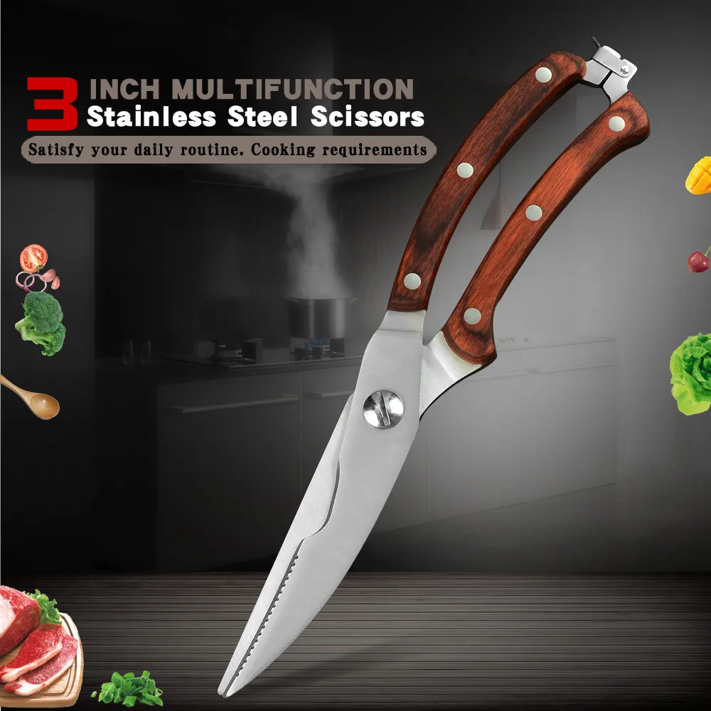 Кухонные ножницы Sowoll из нержавеющей стали изготовлены из высококачественной нержавеющей стали, хорошо подходят для птицы, рыбы и куриной кости, не ржавеют, твердость и долговечность. Цвет деревянной ручкой с безопасным замком, который является Благодаря эргономичному дизайну и безопасный, с антипригарным покрытием, светильник вес, удобная и экономия труда, легко резать, длительный срок службы.