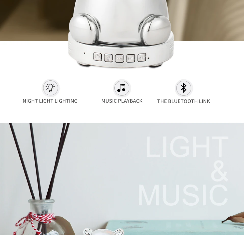 Name:Bluetooth Music LED Night Light Power:1W) Input:DC5V Color:Silver Emitting color:Colorful Size:95*90*140mm Material:ABS,PC Micro Port:USB Port Function:Music light, bluetooth, night light, emergency light,mini, portable Application:night lightemergency light Certification:CE RoHS FCC